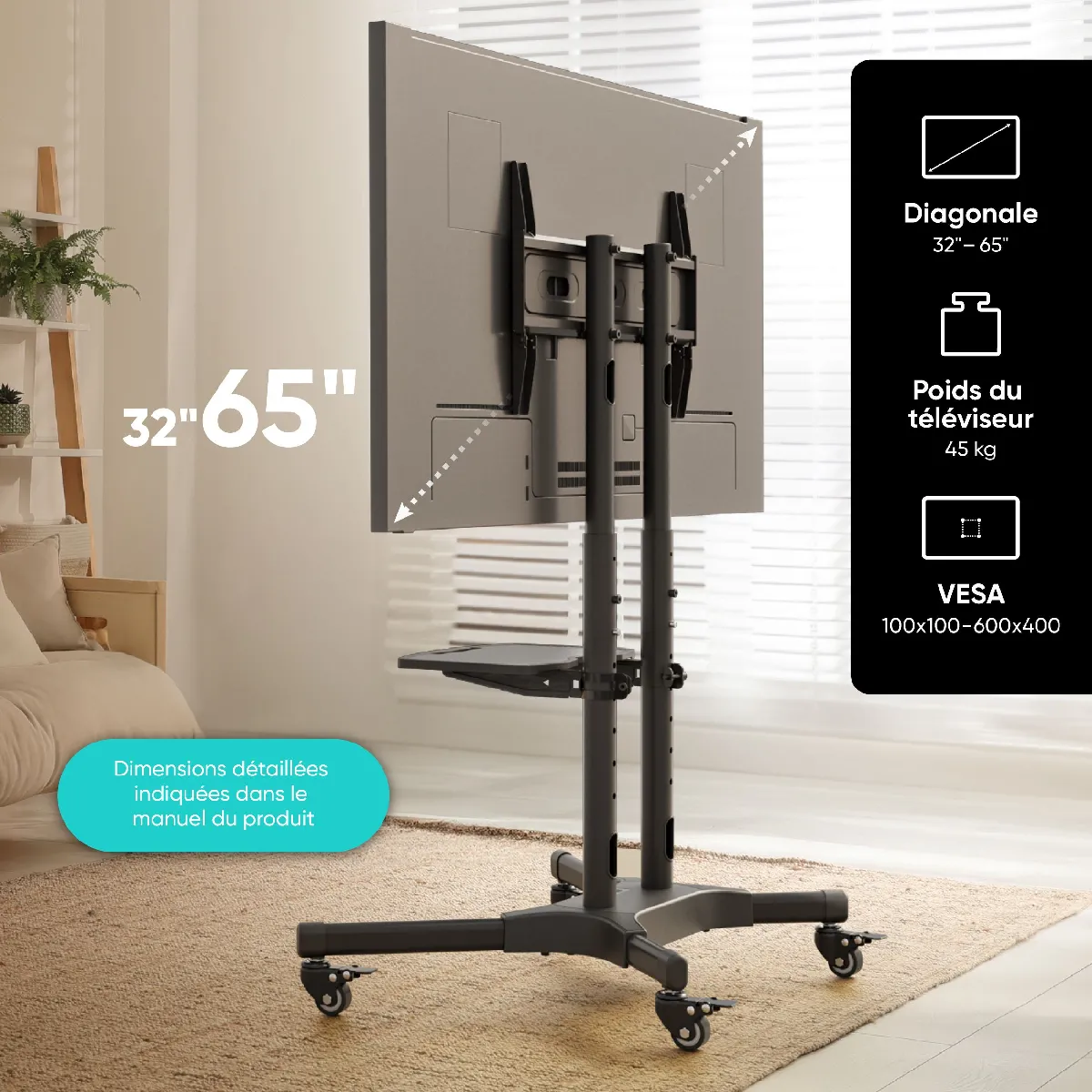 Support TV sur roulettes 32 - 65" - Poids max 45 kg - VESA 100x100 à 600x400 mm - Hauteur réglable