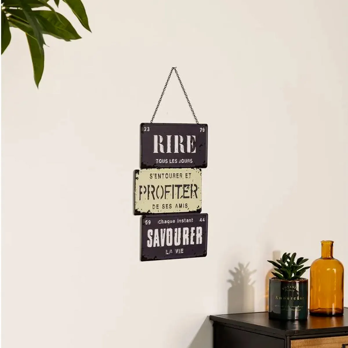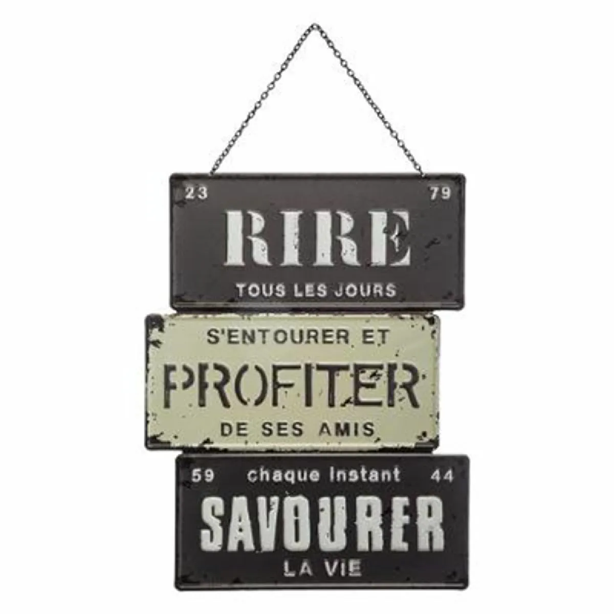 Commentaire vendeur : Informations Techniques : Dimensions : L. 26 x l. 0,2 x H. 34,5 cm Anse : L. 11,8 cm Matière : Fer Spécificités : Rétro & Vintage Décoration Murale Forme Rectangulaire Design à Message Fixation avec chaîne Facile d'entretien & d'utilisation Poids : 0,34 kg Couleur : Noir & Blanc