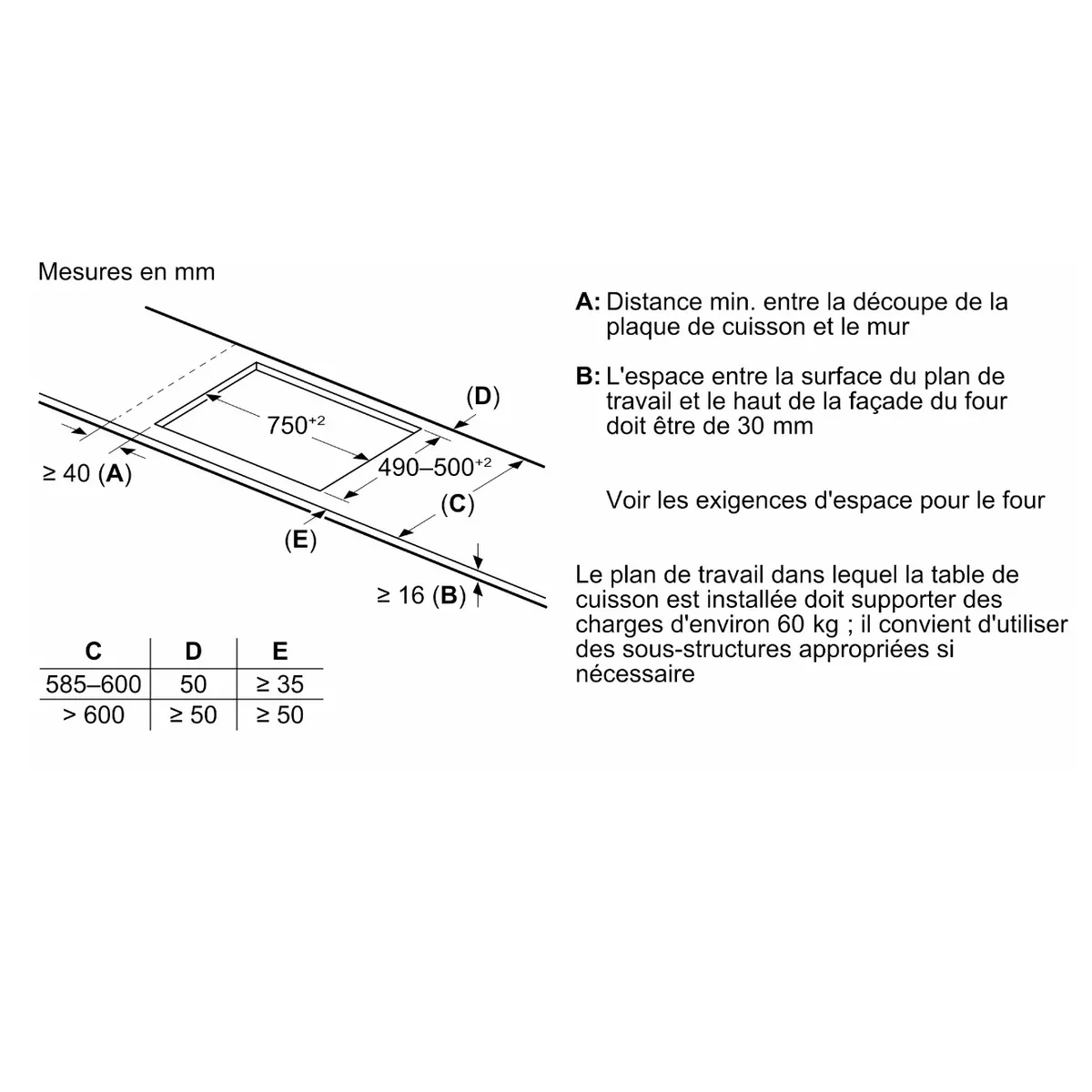 La niche requise est de 51 x 750-750 x 490-500 mm ; vérifiez la compatibilité de votre plan de travail avant l'installation.