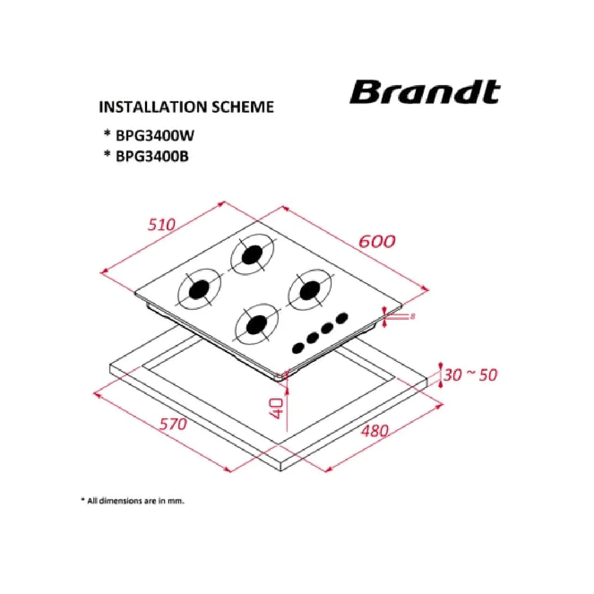 Table de cuisson gaz 60cm 4 feux blanc - BPG3400W - BRANDT |