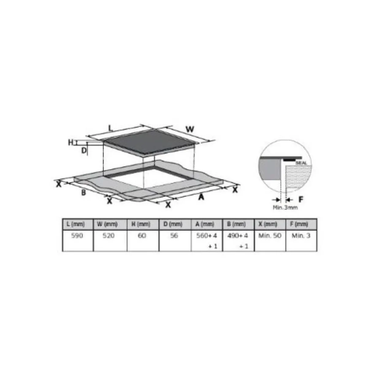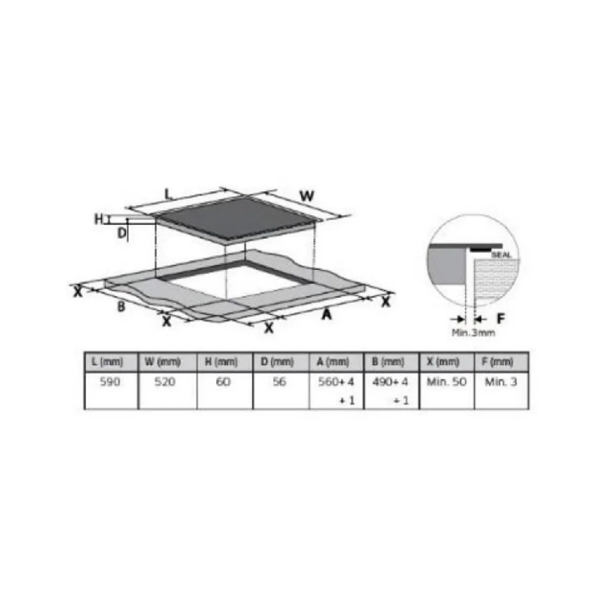 La table de cuisson se pose en encastrable avec des dimensions hors tout de 59 x 5 x 52 cm et un encastrement de 56 x 5,6 x 49 cm. La surface en verre vitrocéramique noir et la bordure avant biseautée favorisent un rendu discret. L'alimentation prévue est de 230 V, 50 Hz, 32 A, pour une puissance totale de 7 200 W. Les commandes frontales restent accessibles, même avec de grands ustensiles.