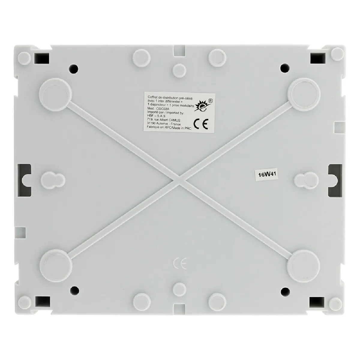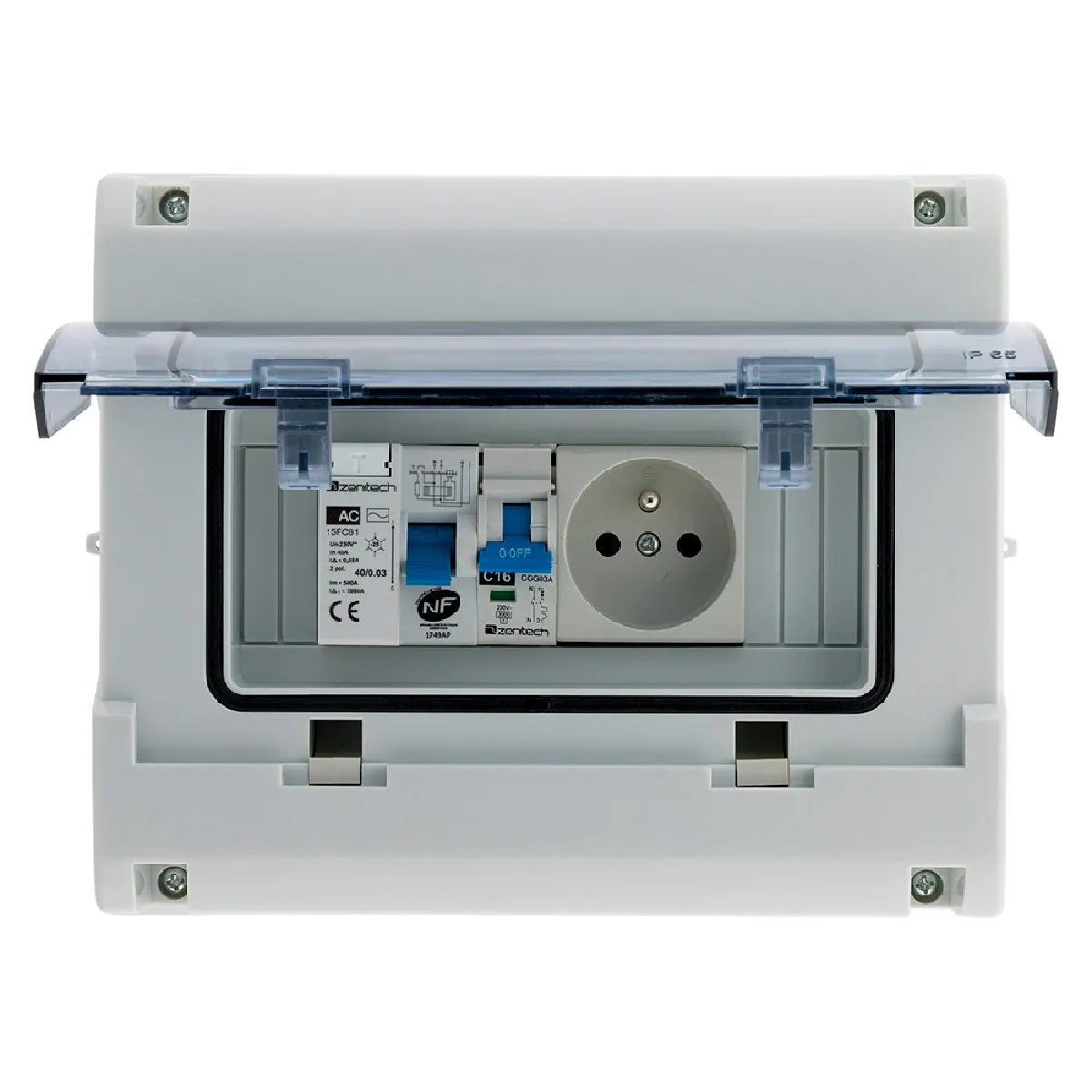 - Équipement intégré : interrupteur différentiel 40/2-30 mA Type AC, disjoncteur 16 A, prise modulaire 16 A 2P+T
