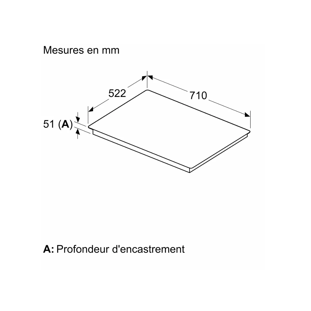 L'appareil s'encastre dans une niche de 51 x 560-560 x 490-500 mm et mesure 51 x 710 x 522 mm. Avec un poids net de 9.4 kg, l'installation reste aisée. Le plan de travail doit présenter une épaisseur minimale de 16 mm pour une tenue correcte. La longueur du cordon de 100 cm facilite le raccordement à proximité. La surface en vitrocéramique garantit une nettoyage simple et uniforme, tandis que la zone modulable optimise la gestion des ustensiles volumineux sans accessoires supplémentaires.