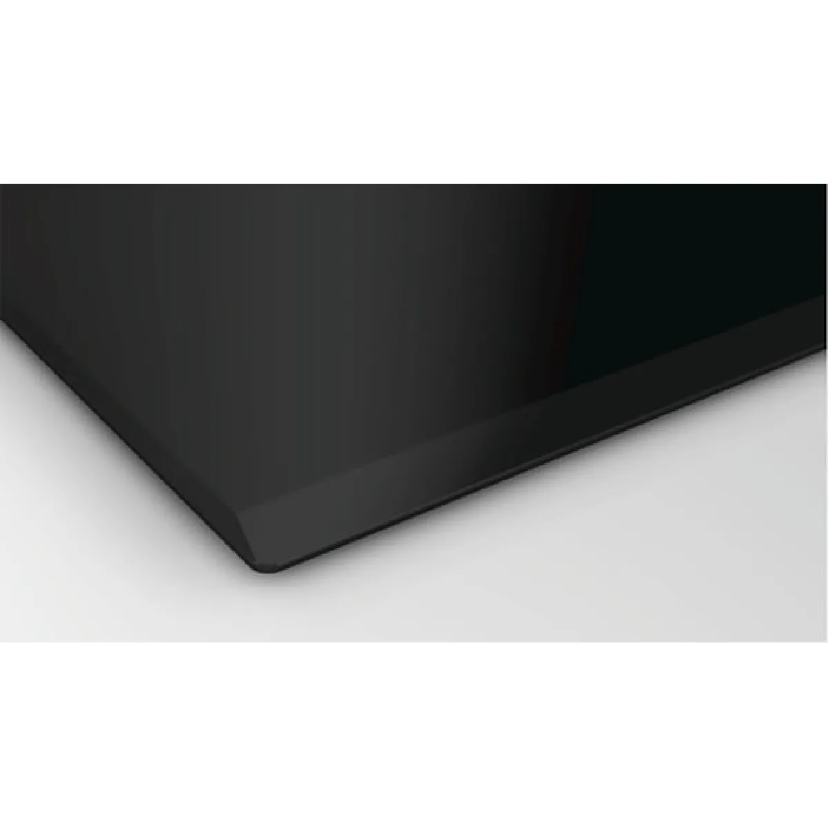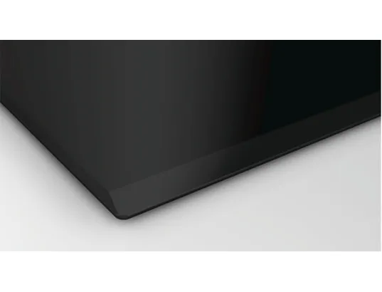 Cette table de 60 cm propose 4 foyers, dont 2 zones flexInduction Plus pouvant fusionner pour accueillir des récipients variés. Configurations disponibles : 1 zone 380 mm x 225 mm à 3,3 kW (PowerBoost 3,7 kW) ou 2 zones Ø 190 mm à 2,2 kW (PowerBoost 3,7 kW), plus une zone Ø 225 mm à 2,2 kW (PowerBoost 3,7 kW) et une zone Ø 190 mm à 2,2 kW (PowerBoost 3,7 kW). La puissance totale atteint 7 400 W. La surface vitrocéramique noire est plane, résistante et simple à entretenir, avec touche nettoyage qui bloque le bandeau 20 secondes en cas de débordement.