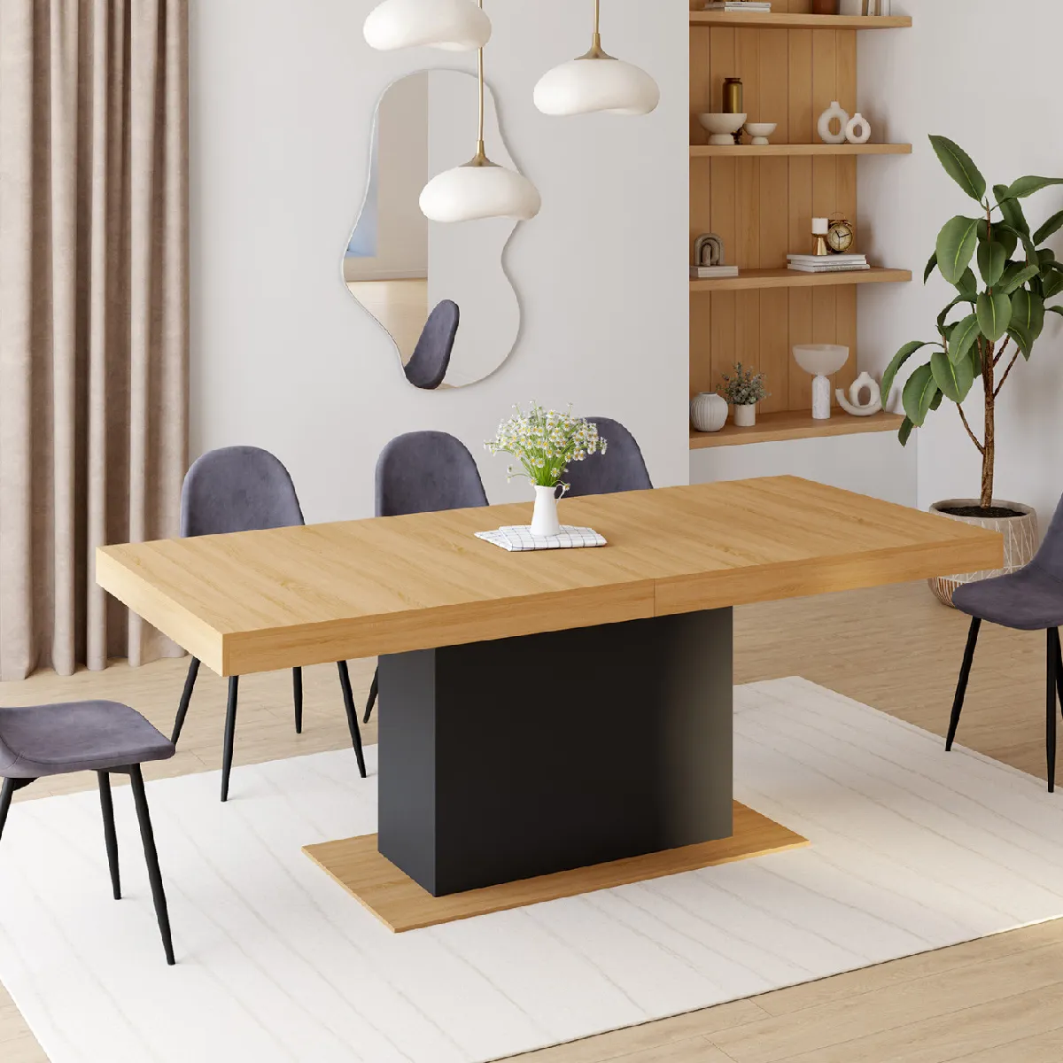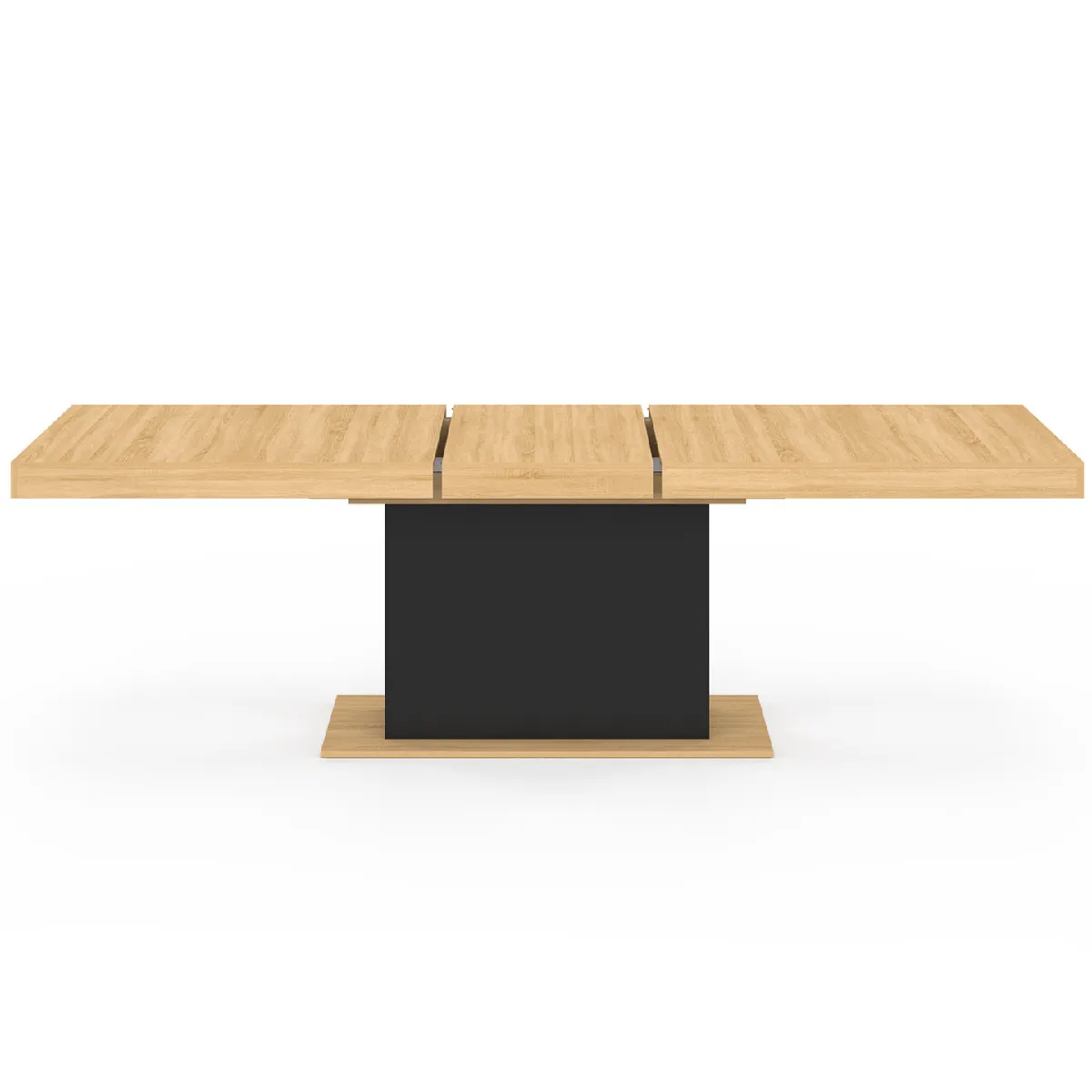 Vous avez une famille nombreuse ou vous aimez recevoir vos proches ? Préparez de bons repas et partagez-les sur une élégante table de salle à manger. Avec son pied central coloris noir et son plateau effet bois naturel, la table à manger extensible EDEN bois et noir s'intégrera parfaitement à votre intérieur en lui apportant un esprit moderne et design !Repas de famille, soirée entre amis... la table à manger extensible EDEN 8-12 personnes s'adapte à vos événements pour un moment convivial ! Grâce à sa rallonge de 50 cm, passez en un rien de temps à un plateau de 250 cm de long pour accueillir tous vos convives. L'extension se range discrètement sous le plateau, pour rester toujours à portée de main.Avec son pied central cossu, la table à manger extensible EDEN est stable et robuste. Grâce à ses dimensions généreuses, cette table rectangulaire 200/250 x 90 cm vous permet d'accueillir de nombreux convives pour partager de bons moments en famille ou entre amis.Cette table à l'aspect massif et aux lignes épurées sera la pièce maîtresse de votre salle à manger. Son style lui donne un aspect chaleureux qui s'adapte parfaitement aux univers classiques et contemporains. La combinaison des coloris bois et noir sera parfaite pour apporter un look chic et sobre à votre salle à manger.N'hésitez plus et craquez pour cette table à manger extensible EDEN 8-12 personnes bois et noir 200-250 cm ! Dimensions de la table à manger extensible EDEN 200-250 cmDimensions globales : Longueur 200-250 cm x largeur 90 x Hauteur 75 cmHauteur des rebords du plateau : 8,5 cmDimensions du socle : L. 110 x l. 54,6 x H. 1,8 cmDimensions du pied central : L. 80 x l. 32 x H. 60 cmDimensions rallonge : L. 50 x l. 90 cmMatériaux : Panneaux de particules mélaminésColoris : bois et noirCapacité : jusqu'à 12 convivesÀ monter soi-mêmeRetrouvez l'ensemble de notre collection moderne sur notre boutique en ligne !