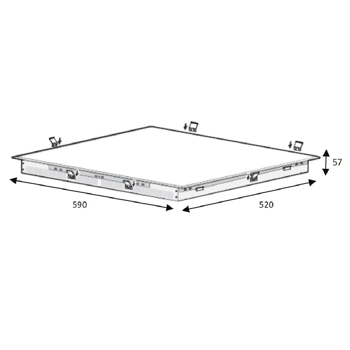 L'encastrement requis est de 56 x 49 cm, pour une table de 59 cm de largeur et 52 cm de profondeur, avec une hauteur de 5.7 cm.