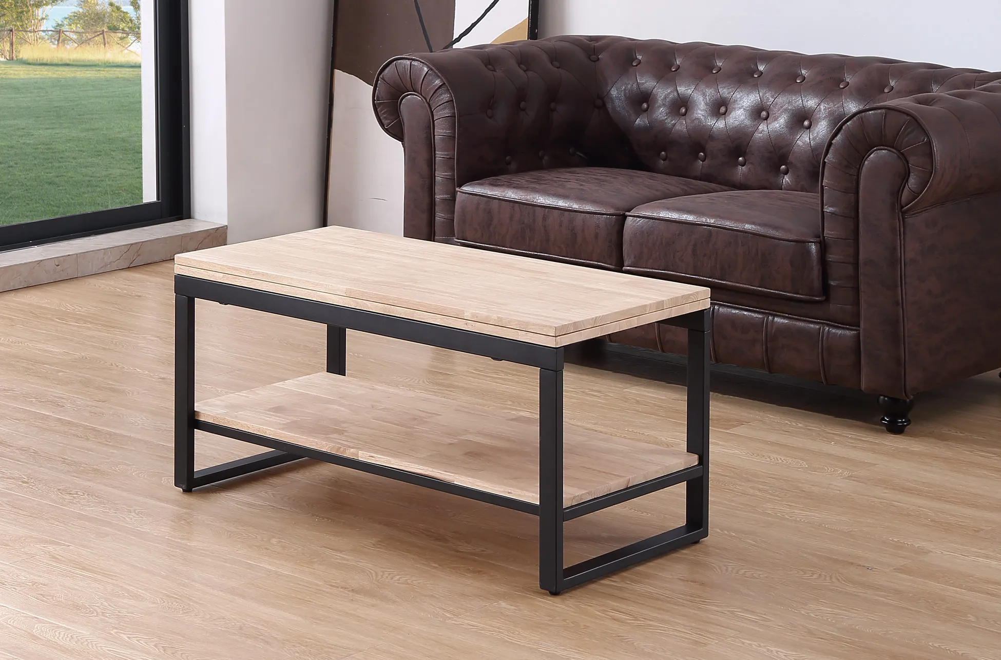 Le plateau relevable transforme la surface selon le besoin, avec une profondeur modulable de 45 cm à 90 cm. Cette amplitude facilite l'usage en table d'appoint pour un repas léger ou en support stable pour ordinateur et documents. Le plateau en bois de 18 mm d'épaisseur assure une base homogène, tandis que la structure en métal finition époxy mat renforce la rigidité. L'étagère inférieure conserve télécommandes et magazines à portée de main pour un espace de vie plus ordonné.