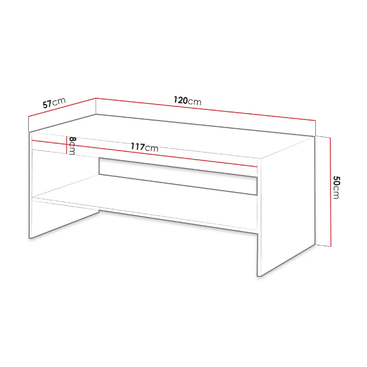 L'esthétique rectangulaire met en valeur une structure aux lignes fines avec motif linéaire en relief, créant un rendu moderne sans surcharge visuelle. La niche ouverte est située sous le plateau pour garder à portée de main magazines, accessoires multimédias ou boîtes de rangement, tandis que le grand plateau de 120 x 57 cm facilite le service et l'organisation. Les panneaux de particules et stratifiés de 16 mm constituent une base robuste adaptée aux usages quotidiens du salon.