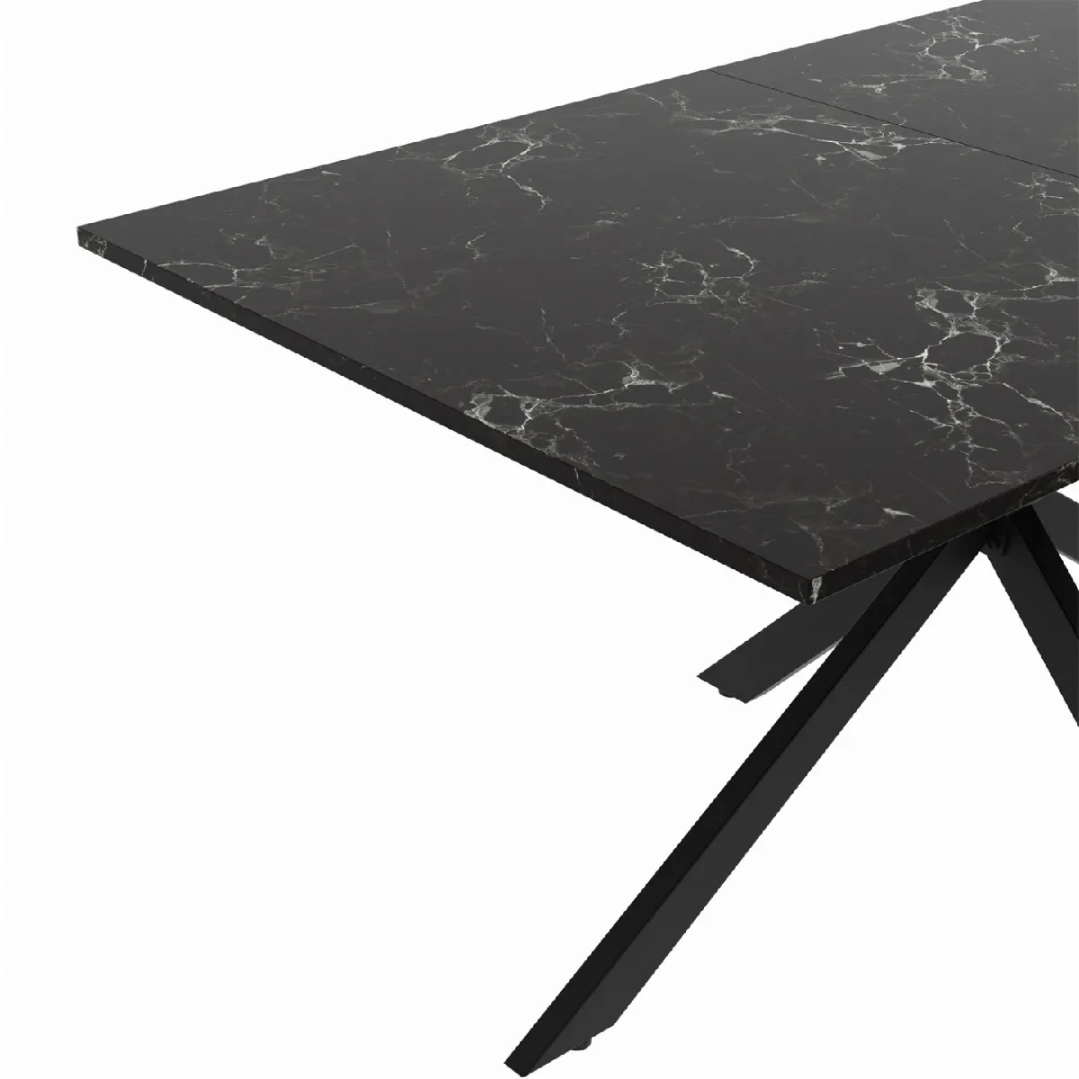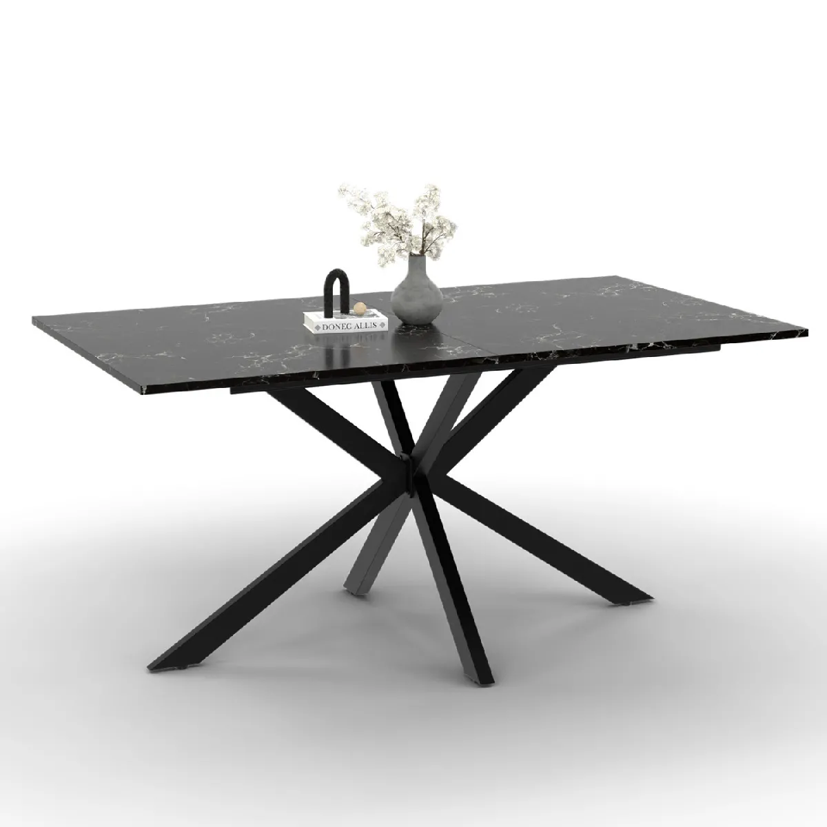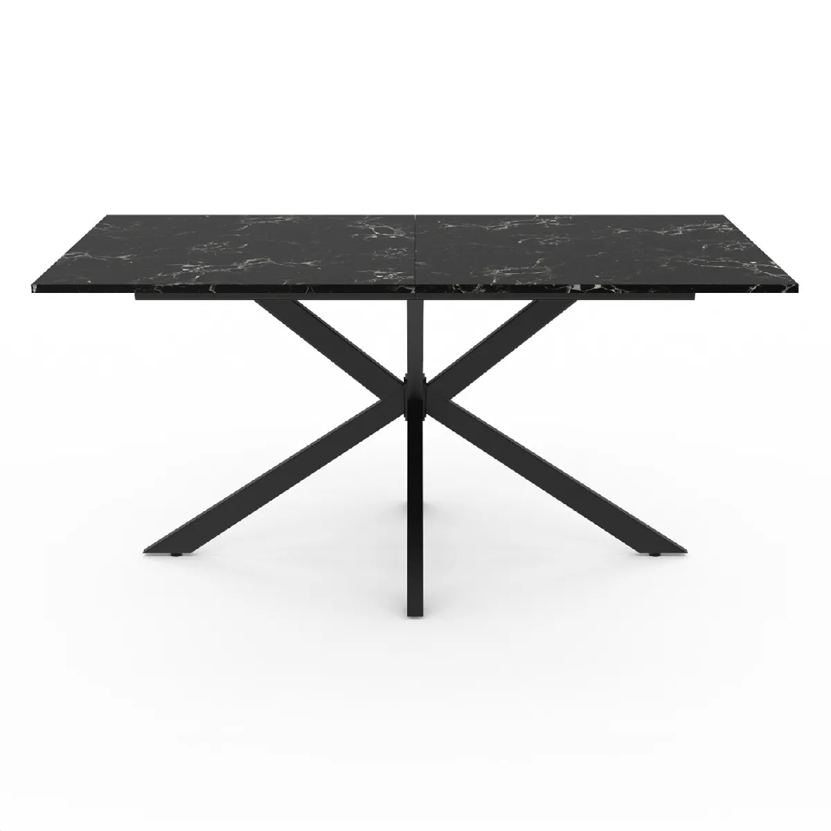 Le style moderne s'invite dans votre salle à manger avec cette table ALASKA 160 cm bi-matière d'une capacité de 8 personnes !Le plateau effet marbre et le pied central en métal noir s'associent pour un look chaleureux "bohème chic" qui se mariera parfaitement avec votre décoration intérieure.Son pied araignée en métal noir lui apporte une touche d'originalité et de modernité ! Le plateau effet marbre au coloris noir lui confère, quant à lui, une allure élégante et élancée. Pour vous permettre de partager de bons repas en famille ou entre amis, la table ALASKA est dotée d'un plateau de 160 x 90 cm qui offre une capacité d'accueil de 8 personnes ! Sa structure en MDF est robuste et son pied en métal noir (6x3 cm) lui assure une très bonne stabilité.Sublimez votre intérieur avec l'alliance de l'effet marbre et du métal pour un look tendance !Dimensions de la table ALASKA effet marbre noir et métal 160 cmDimensions globales : Longueur 160 cm x largeur 90 cm x Hauteur 75 cmDimensions des pieds : 6 x 3 cmMatériaux : pieds en métal et panneaux de particules mélaminésColoris : pieds noirs et plateau effet marbre noirPlateau coupé en 2À monter soi-mêmeCe modèle est également disponible en coloris blanc.Retrouvez l'ensemble de notre collection ALASKA sur notre boutique en ligne !
