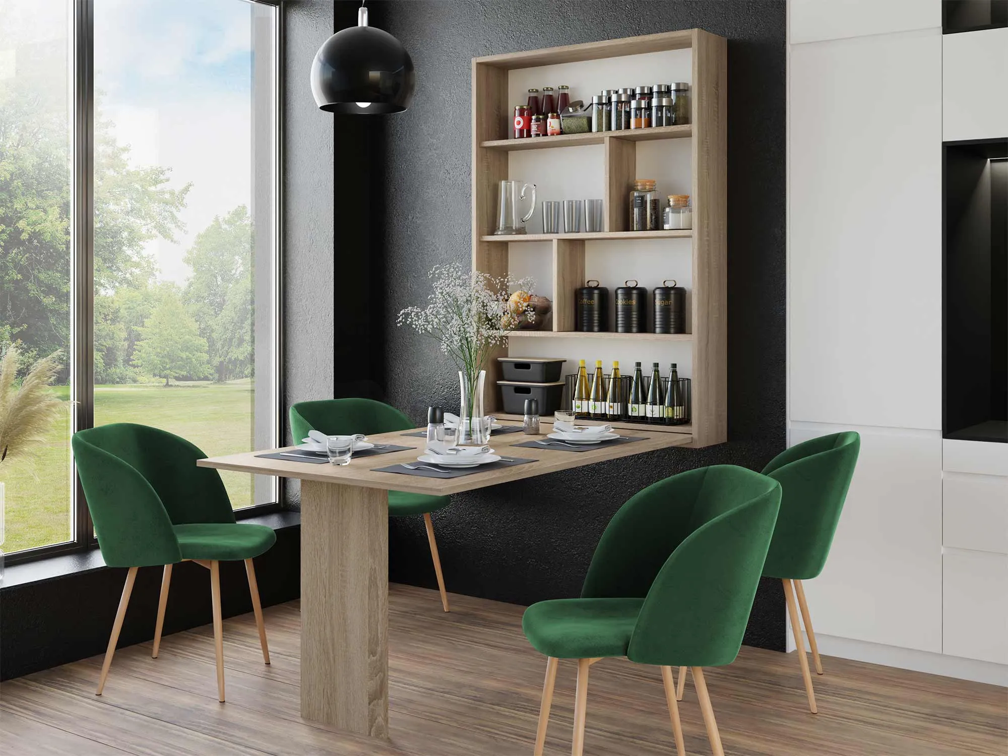 Le meuble intègre 4 étagères et 6 niches accessibles après dépliage afin de garder ustensiles, vaisselle ou fournitures à portée de main. L'ouverture ne nécessite ni poignées ni système push to open, et un dispositif de fermeture par crochet maintient la table en position. La fabrication est européenne et le produit est à monter soi-même. Les coloris disponibles sont blanc, bois ou noir/bois pour s'accorder à différents environnements, qu'il s'agisse d'une cuisine, d'un bureau ou d'une chambre.
