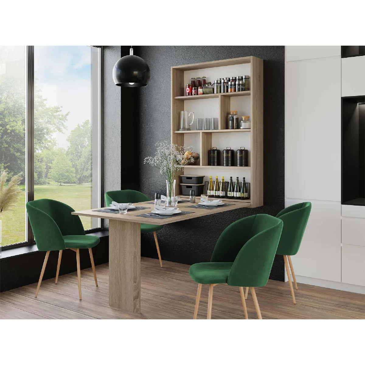 Gain de place immédiat avec une solution qui combine table à manger pliante et module de rangement vertical. Cette configuration murale passe de la position fermée à un véritable coin repas ou bureau en quelques secondes, tout en conservant une surface matte résistante à l'humidité et aux rayures. Le plateau offre un format adapté pour accueillir jusqu'à quatre convives, puis se replie pour libérer le passage. La structure en panneau stratifié et panneau de particules de 18 mm s'intègre dans des intérieurs contemporains. Une fois fixée, la hauteur occupée au mur reste constante, ce qui facilite l'aménagement autour du meuble et l'organisation quotidienne dans un studio ou une cuisine.