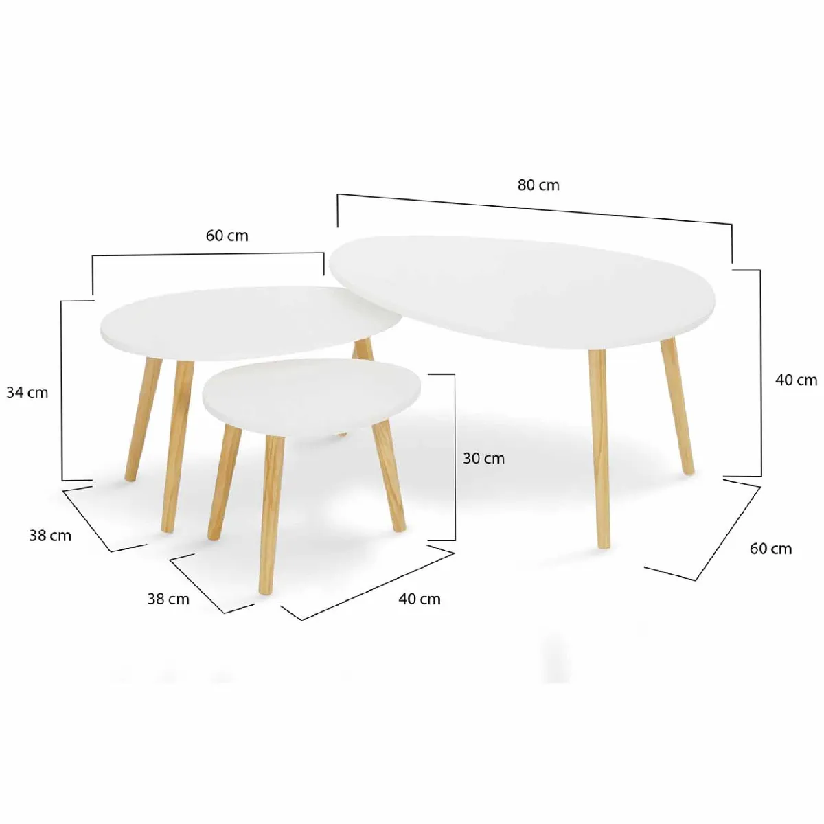 Apportez une vraie touche contemporaine à votre séjour grâce à ce lot de 3 tables basses gigognes aux finitions laquées blanches qui s'accorderont parfaitement à votre intérieur. Leur design, d'inspiration nordique, est à la fois ultra-tendance, simple et sophistiqué.À la fois pratiques et jolies, libre à vous d'agencer ces tables basses gigognes de la manière dont vous le souhaitez pour créer l'intérieur qui vous ressemble. Elément déco ou tables de rangement pour vos magazines, télécommandes ou petites plantes d'intérieur, chacune aura son utilité ! Idéales pour vos soirées télé ou apéritifs entre amis, vous pourrez également les placer facilement les unes sous les autres pour un rangement optimal permettant de gagner de l'espace !Véritables éléments de décoration, les tables basses gigognes apporteront un certain cachet à votre intérieur. Grâce à leur forme ovale et à leurs pieds en bois solides, ces tables de salon originales donneront un côté chaleureux à votre pièce de vie.La surface laquée brillante des tables offre quant à elle une touche contemporaine à votre intérieur et une finition raffinée. Enfin, le coloris blanc associé au bois clair des pieds créera à la fois de la luminosité et du contraste, pour un design épuré, chic et moderne.Que votre espace salon soit relativement petit ou très spacieux, ces trois tables basses GAIA y trouveront forcément leur place. À utiliser seules, par 2, par 3, créez une atmosphère cocooning à petit prix grâce à ce lot au style scandinave !Dimensions des 3 tables basses gigognes GAIADimensions de la grande table basse : Longueur 80 cm x largeur 60 cm x Hauteur 40 cmDimensions de la moyenne table basse : L. 60 x l. 38 x H. 35 cmDimensions de la petite table basse : L. 40 x l. 34 x H. 30 cmMatériaux : MDF et pieds en boisColoris : Blanc aux finitions laquées À monter soi-mêmeRetrouvez l'ensemble de notre collection scandinave sur notre boutique en ligne.