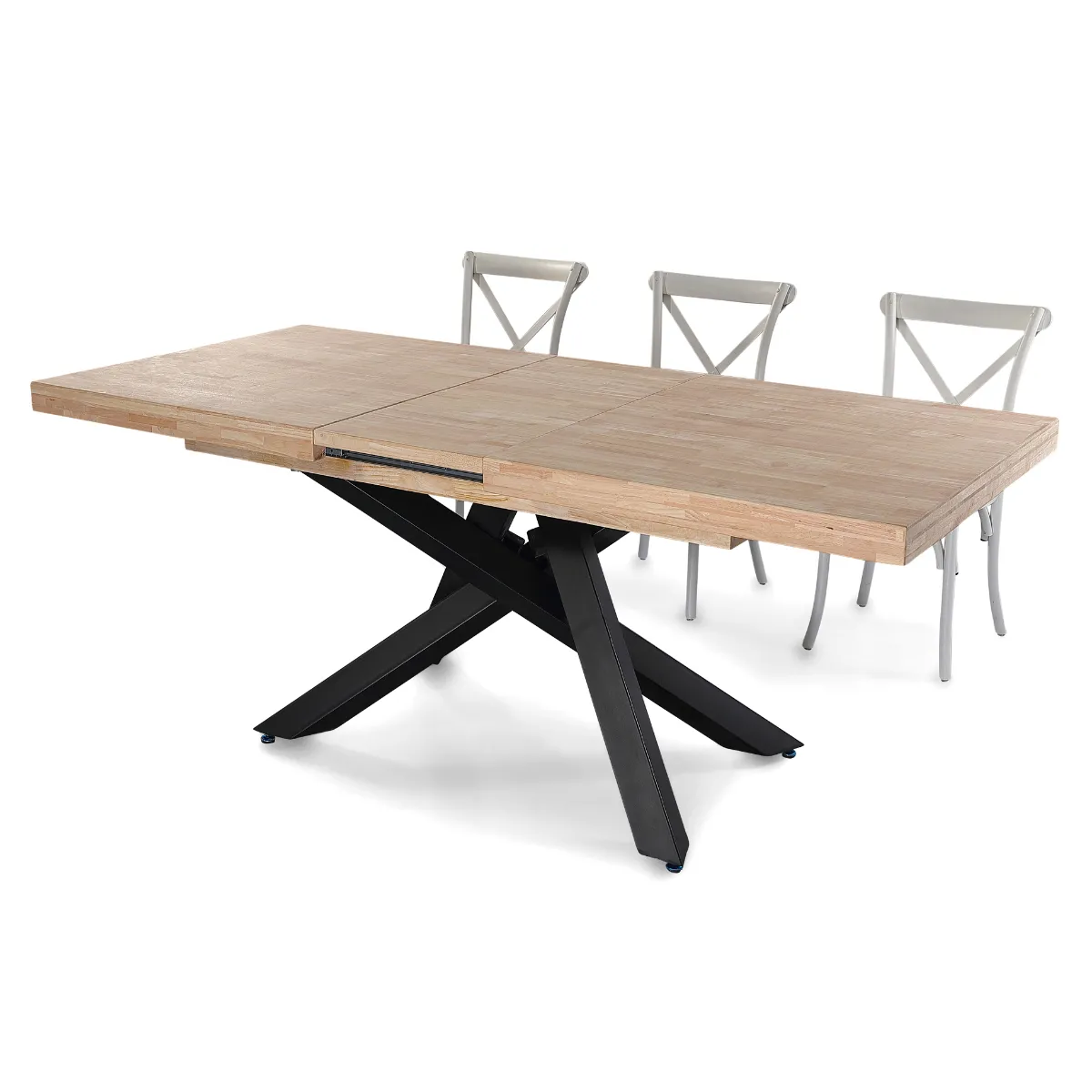 - Plateau et rallonges en bois de chêne nordique pour une continuité visuelle lors de l'extension