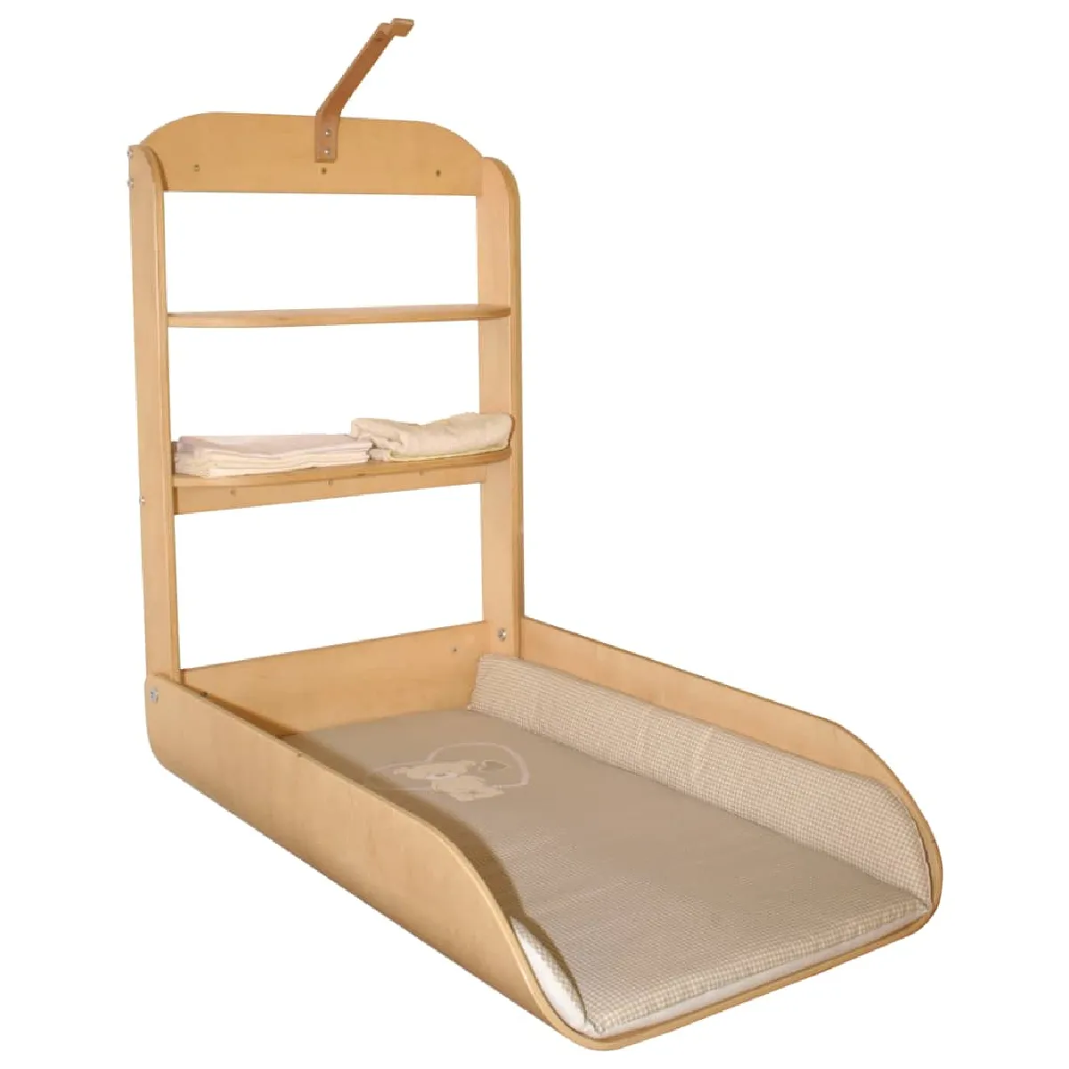 Cette table à langer murale pliante Lovely Bear de roba offre un espace de rangement confortable, pratique et confortable pour votre tout-petit. La table à langer est en bois lamellé et convient aux enfants jusqu'à 15 kg. De plus, elle est équipée d'un bouton-pression pour une ouverture et une fermeture faciles d'une seule main. Avec cette unité de changement pratique comprenant un matelas à langer, vous pouvez créer un intérieur flexible pour votre bébé. Une étagère à mi-chemin du mur arrière de la table à langer offre un espace supplémentaire pour vos nécessités, qui peut être rangée en toute sécurité et bien rangée même lorsque l'étagère est repliée. De plus, le matelas à langer rembourré et doux est recouvert d'un film lavable (sans phtalate) et a des bords surélevés, procurant au bébé une sensation de sécurité pendant le changement.
