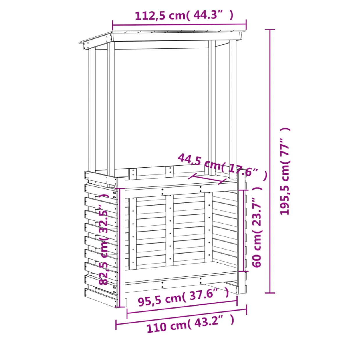 Table haute - Bois de pin massif - 112,5 x 57 x 195,5 cm - Toit pour ombrage - Étagères de rangement