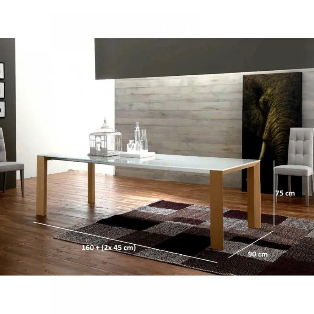 Le plateau passe de 160 à 250 cm pour accueillir jusqu'à de grandes tablées familiales dans un espace maîtrisé. La profondeur de 90 cm laisse assez de place pour la vaisselle et les plats, tandis que la structure verre et bois massif assure rigidité et alignement. Les rallonges en verre sérigraphié identique conservent un aspect uniforme une fois déployées, sans rupture visuelle. La hauteur standard de 75 cm favorise une assise confortable avec la plupart des chaises, et le format rectangulaire s'intègre facilement le long d'un mur ou au centre d'une pièce.