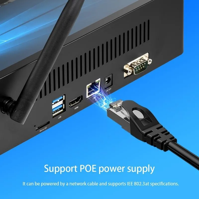 Le WiFi double bande (2,4/5 GHz) et le Bluetooth 4.0 assurent une connexion rapide aux réseaux et accessoires. La présence d'un port RJ45 apporte une liaison réseau filaire stable pour les environnements fixes. Les sorties et entrées physiques incluent HDMI pour un moniteur ou un téléviseur, quatre ports USB 2.0 pour souris, clé USB ou imprimante, une prise casque 3,5 mm, un slot TF et un port RS232 DB9 pour besoins spécifiques en liaison série.