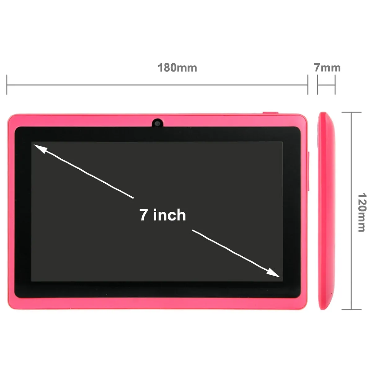 Commentaire vendeur : Tablette tactile Android 6.0 de 7 pouces. Petite mais costaud ! Dotée d'un processeur Quad Core cadencé à 1.34 GHz couplé à 1024 Mo de mémoire vive, elle permet de profiter pleinement de toutes les applications du Play Store, de vos photos, de regarder des films HD, de jouer ou d'organiser votre journée. Carte Micro SD 16 Go (possible jusqu'à 128 Go) fournie. Couleur : Rose.Caractéristiques techniques : Marque: Yonis- Système d'exploitation : Android 6.0- Processeur : Allwinner A23 Cortex A7 Quad core 1.34GHz - Résolution de l'affichage : 1024*600 pixels- Taille d'écran : 7 pouces- Résolution caméra frontale : 0.3 Méga Pixels- Résolution caméra arrière : 2 Méga Pixels avec flash- Enregistrement vidéo : Oui- Haut-parleurs : Oui- Type d'écran : Tactile capacitif LCD- Mémoire vive / RAM : 1024 Mo DDR3- Mémoire interne : 8 Go- Format d'image : JPEG, BMP, GIF, PNG- Format de musique : MP3, WMA, AAC, WAV, APE, OGG, FLAC- Format vidéo : AVI, WMV, RM, RMVB, MKV, 3GP, MP4, MOV, FLV, VOB, Flash 10.1, Flash 10.2, Flash 10.3- Format Office : Word, Excel, PPT- Format e-book : TXT, PDF- Bluetooth : non- Compatible WiFi 802.11b, - Ports : 1 x Micro USB v2.0, 1 x Jack 3.5 mm , 1 x Jack DC - Multilingue : Français, Anglais, Allemand, Espagnol, Portugais, Turc, Japonais...- Autres : G-sensor, navigateur, Google Play, Email, Agenda, Calculatrice, Horloge, Maps, enregistreur, etc- Batterie : Lithium 3.7V/2500mAh - 5V/2A DC- Autonomie : Dépend ...