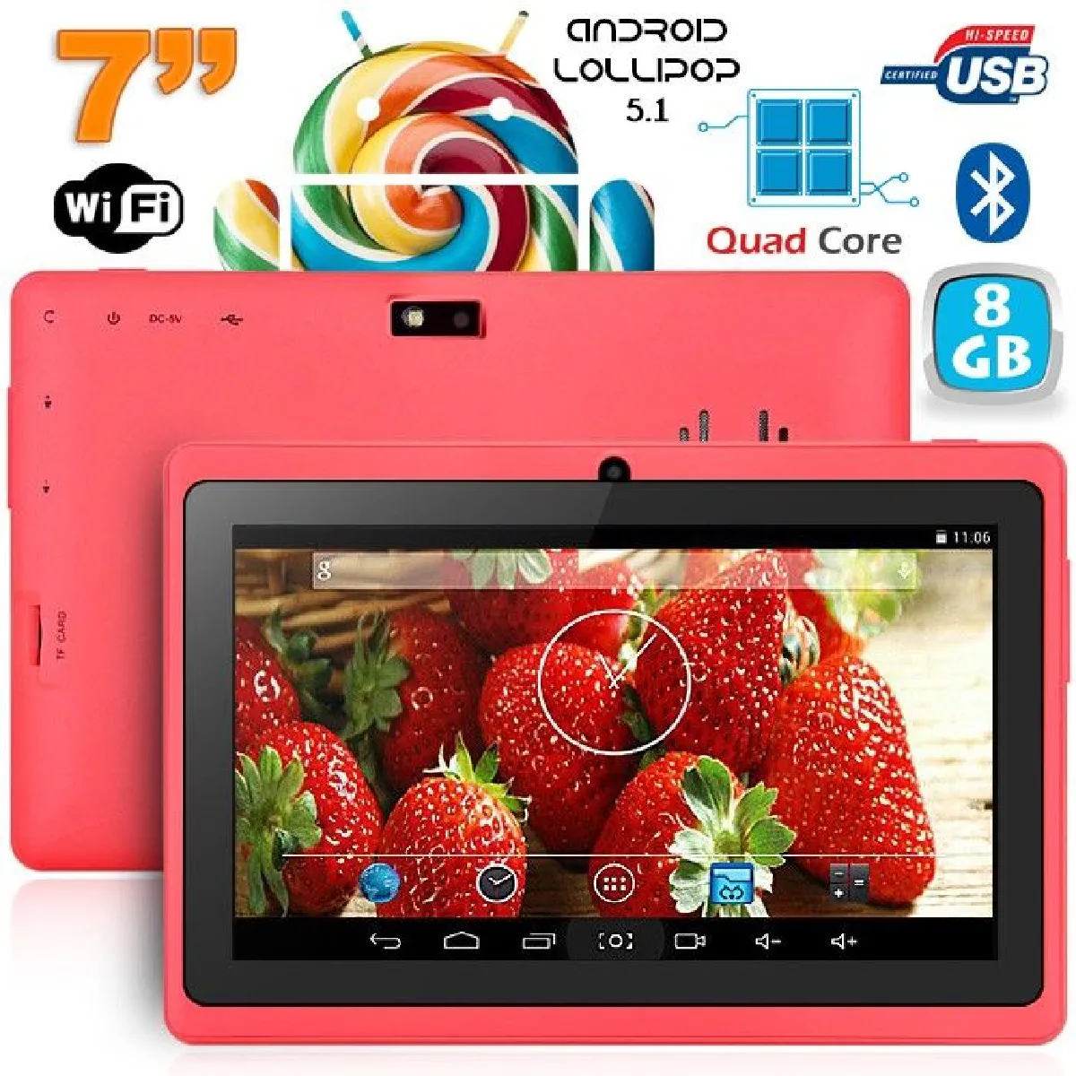 Commentaire vendeur : Tablette 7 pouces combinant élégance et performances. Fonctionnant sous Android 6.0, équipée d'un processeur Quad Core de 1.34 GHz et 1 Go de RAM, elle permet de profiter pleinement de toutes les applications du Play Store et de la puissance d'Android. Double caméra dont une avec flash. Connexion Wifi et Bluetooth. Mémoire interne : 8Go. Couleur : Rose.Caractéristiques techniques : Marque: YonisCaractéristiques techniques :Système d'exploitation : Android 6.0Processeur: Allwinner A23 Cortex A7 Quad core 1.34GHzMémoire vive / RAM : 1 Go DDR3Type d'écran : Tactile capacitifTaille d'écran : 7 poucesRésolution de l'écran : 1024 x 600 pixelsMémoire interne : 8 GoExtension de mémoire : Carte Micro SD allant jusqu'à 128 Go (non fournie)Connexions sans fil : WiFi & bluetoothRésolution caméra frontale : 0.3 Méga PixelsRésolution caméra arriére : 2 Mégapixels avec flashEnregistrement vidéo : OuiHaut-parleurs : OuiPuissance Haut-parleur : 0.5WFormat d'image pris en charge : JPEG, BMP, GIF, PNGFormat de musique pris en charge : MP3, WMA, AAC, WAV, APE, OGG, FLACFormat vidéo pris en charge : AVI, WMV, RM, RMVB, MKV, 3GP, MP4, MOV, FLV, VOB, Flash 10.1, Flash 10.2, Flash 10.3Ports : 1 x Micro USB v2.0, 1 x Jack 3.5 mm , 1 x Jack DCMultilingue: Français, Anglais, Allemand, Espagnol, Portugais, Turc, Japonais...Autres : G-sensor, navigateur, Google Play, Email, Agenda, Calculatrice, Horloge, Maps, enregistreur, etcBatterie : Lithium 3.7V/2...
