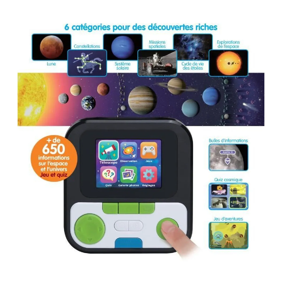 Le VTECH Télescope Genius XL propose un usage pas à pas avec modes guidés dédiés à l'exploration et à l'observation documentée. L'écran intégré affiche en direct les images captées, tandis que la fonction photo conserve les moments clés. Le zoom x110 aide à grossir des détails du paysage céleste pour des sessions d'initiation ou d'approfondissement. L'appareil s'appuie sur plus de 200 médias NASA pour contextualiser les cibles observées et illustrer les notions essentielles d'astronomie.