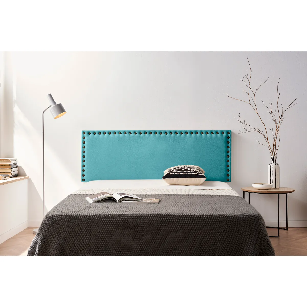 C'est une tête de lit au tissus sobre avec une touche d'élégance offerte par les clous placés sur son contour.
