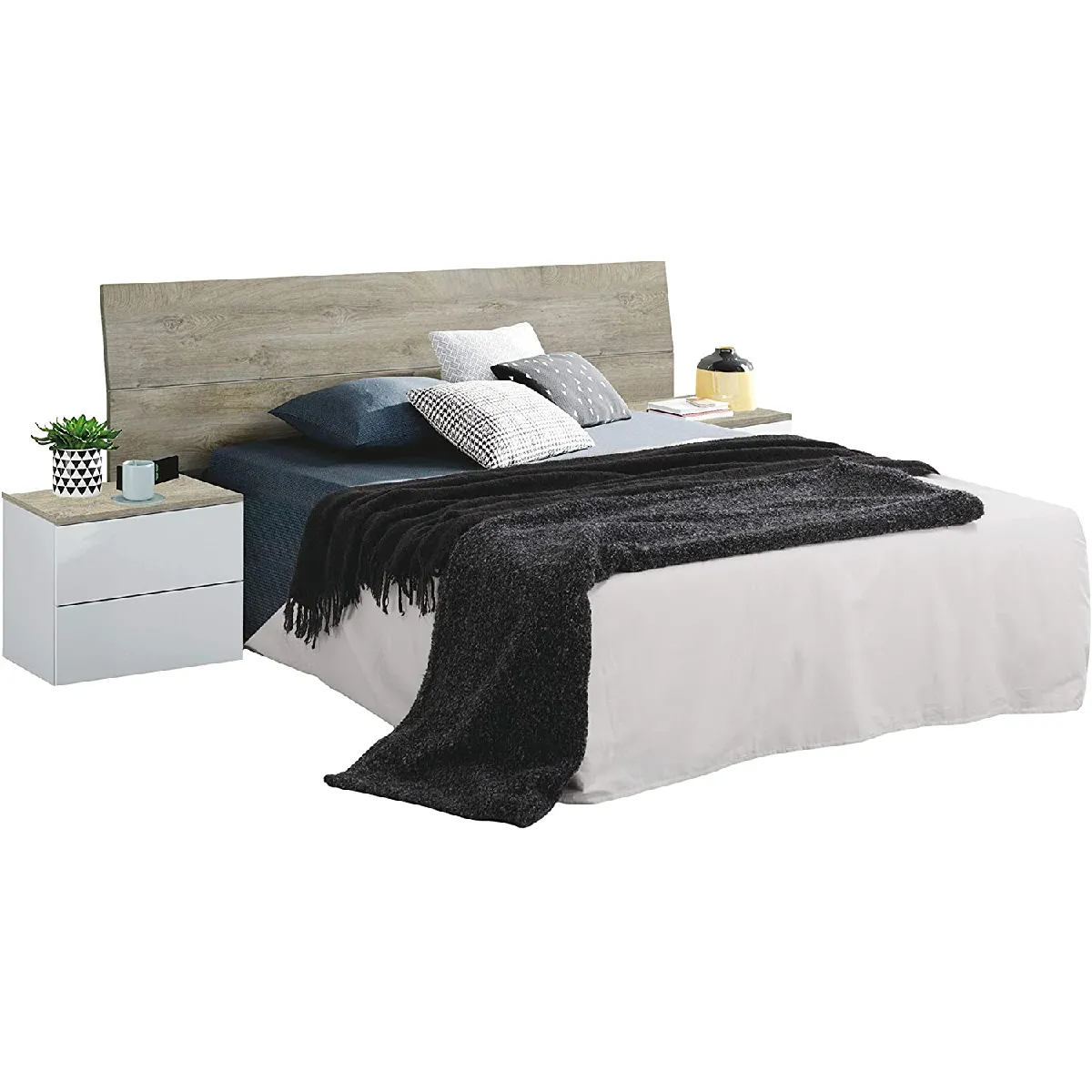 L'association d'une grande tête de lit et de deux chevets coordonnés offre un point focal pratique et soigné pour un lit double. La structure en panneau aggloméré haute densité avec finition mélamine présente une surface non poreuse, simple à dépoussiérer et résistante aux usages du quotidien. Le coloris blanc artic associé au chêne à nuds Alaska apporte une touche actuelle qui se marie à des ambiances claires comme plus chaleureuses. Avec une largeur utile adaptée aux lits de 135 à 150 cm, l'ensemble optimise l'espace et regroupe la zone nuit en un seul module cohérent. Montage requis.