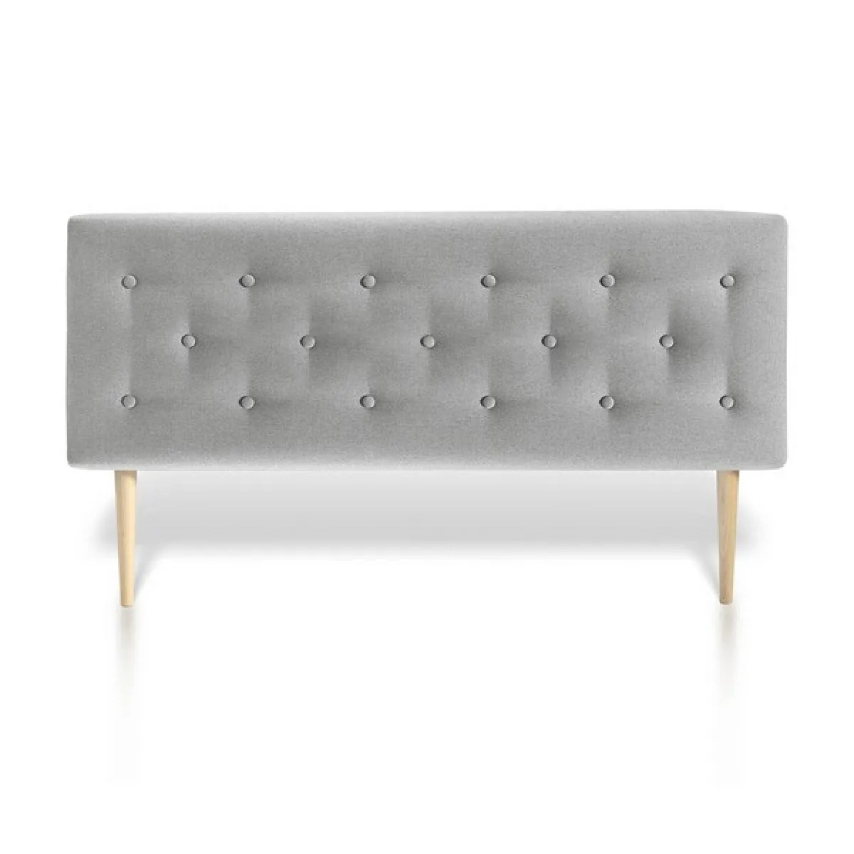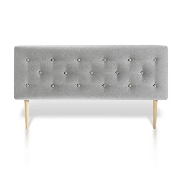 Le capitonnage ton sur ton crée une surface douce, tandis que la mousse HR frontale et sur les angles atténue les points de pression lors d'un appui prolongé. Avec son tissu gris et sa silhouette scandinave, cette tête de lit s'associe facilement aux palettes neutres comme aux bois clairs. Les pieds en hêtre naturel renforcent l'esthétique nordique et assurent une pose stable au sol.