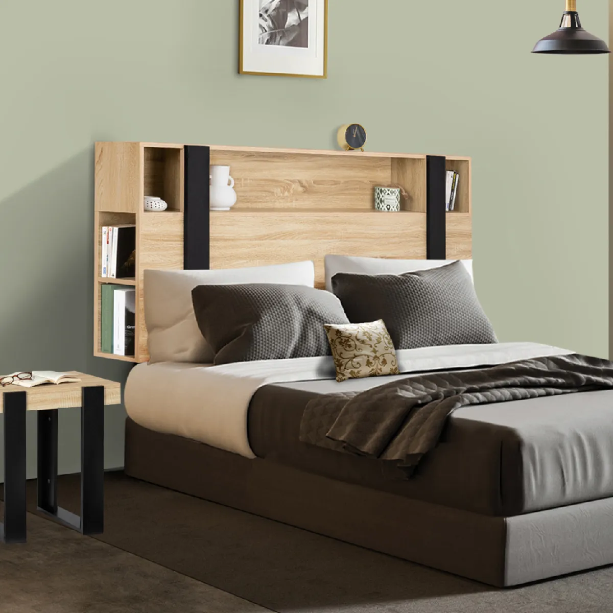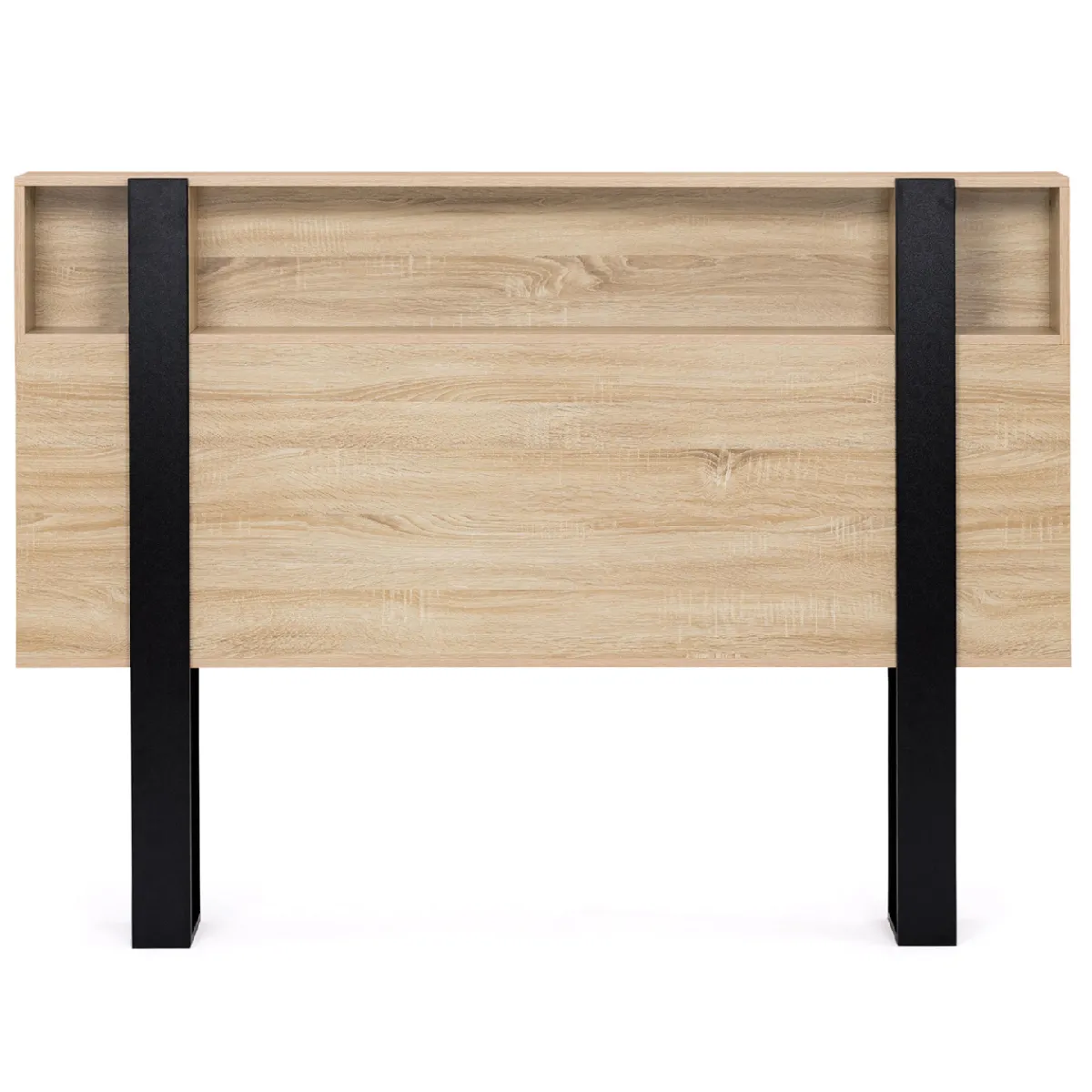 Agencez votre intérieur avec style avec la tête de lit PHOENIX au design industriel bois et noir !Alliant design et fonctionnalité cette tête de lit apportera rangement et modernité à votre chambre à coucher. Ses dimensions de L.160 x l.20 x H.120 CM rendent cette tête de lit compatible aussi bien pour un lit de 140 cm que pour un lit de 160 cm.Profitez de ses nombreuses niches supérieures et latérales pour entreposer tout votre nécessaire de nuit : réveil, téléphone, livre ou encore tablette !Optimisez le rangement de votre espace nuit grâce à la tête de lit PHOENIX et appréciez le confort d'une chambre toujours ordonnée.Grâce à ses larges pieds en bois de 43 cm de haut, cette tête de lit vous garantit stabilité et solidité dans le temps. Adossez-vous confortablement à l'aide de votre oreiller sur la tête de lit et profitez d'un moment détente lecture ou devant votre série préférée. Design, fonctionnelle et cossue, cette tête de lit à tous les atouts nécessaires pour faire de votre chambre à coucher, un espace tendance et ordonné !Dimensions de la tête de lit PHOENIX hêtre et noir- Dimensions globales : Longueur 160 cm x largeur 20 cm x Hauteur 120 cm- Dimensions de la grande niche frontale : L. 107 x l. 20 x H. 23 cm- Dimension des petites niches frontales : L. 16 x l. 20 x H. 23 cm- Hauteur des niches latérales : 23 cm- Hauteur des pieds : 43 cm- Distance entre les pieds : 107 cm- Matériaux : Particules de bois (PB), épaisseur 15 mm- Coloris : hêtre et noir- À monter soi-mêmeRetrouvez également toutes nos têtes de lit disponibles sur notre boutique en ligne !