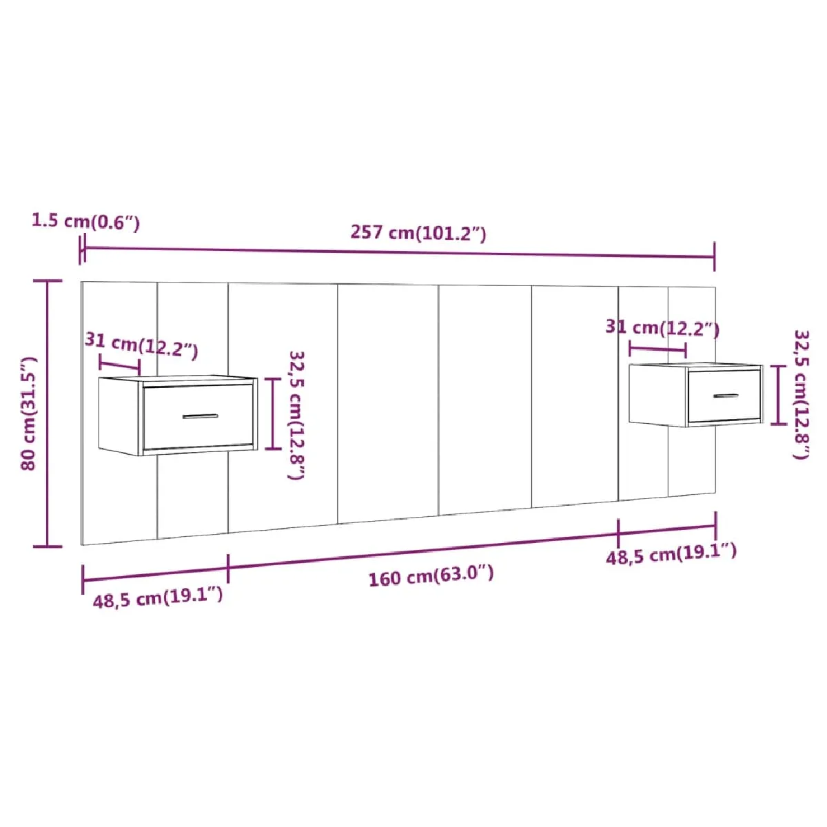 - Dimensions de la tête de lit : 160 x 1,5 x 80 cm (L x l x H)