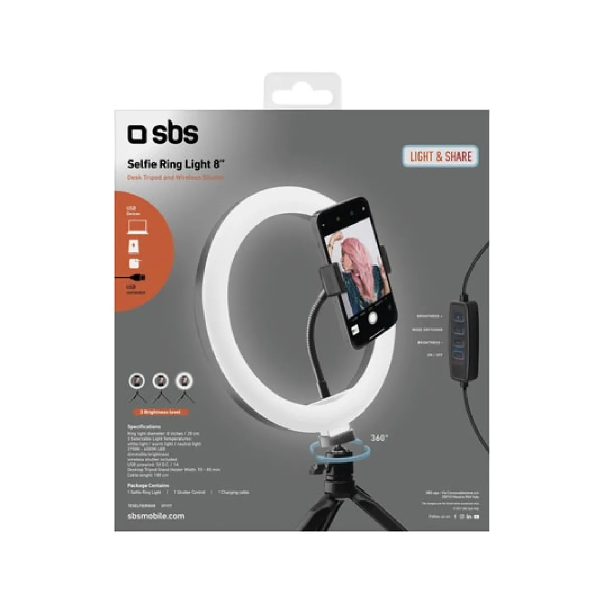SBS Perche à selfie avec anneau lumineux - Noir