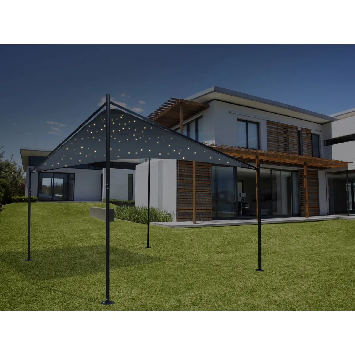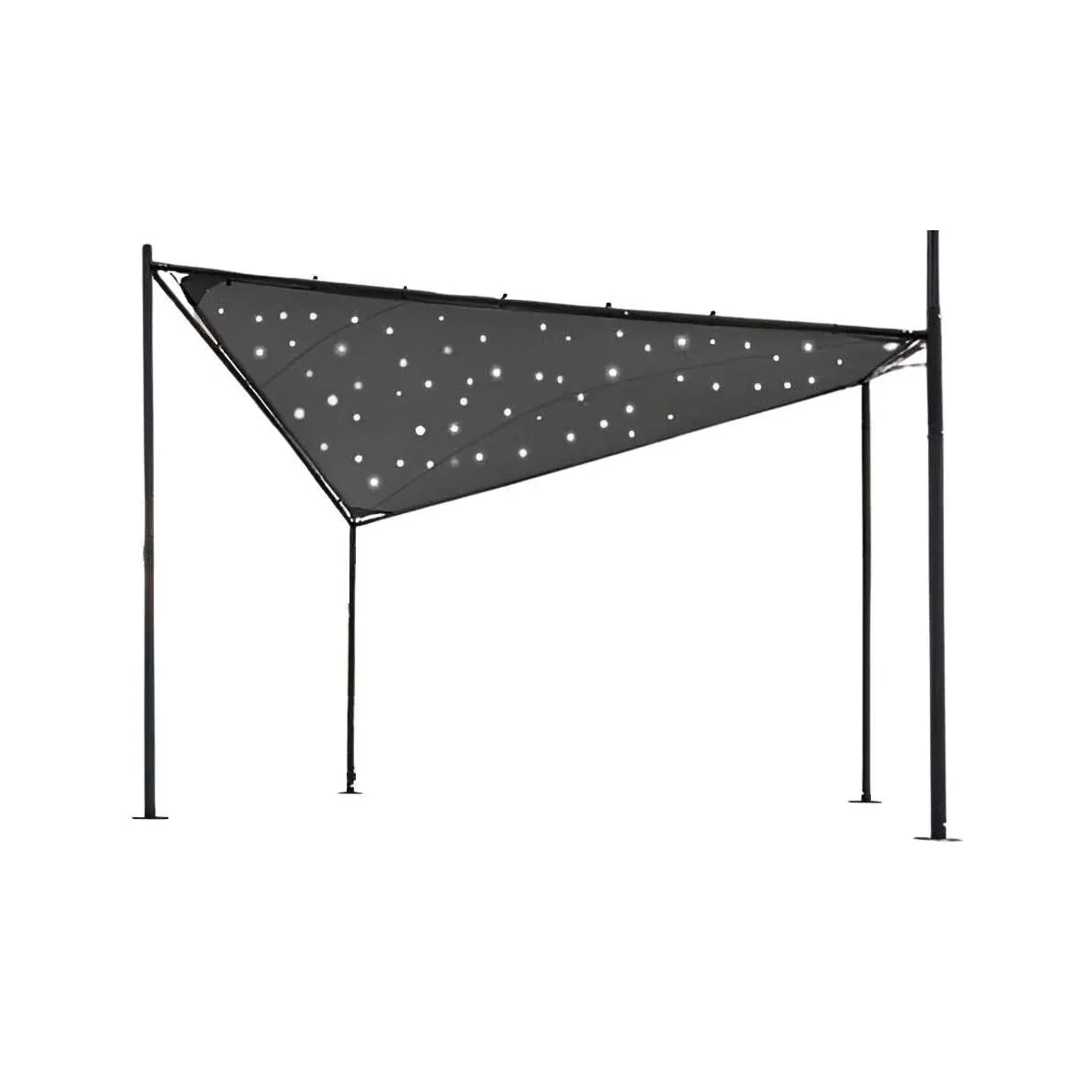 Informations complémentaires : Hauteur point le plus bas : 209 cm , Fixation de la toile par tendeurs élastiques et tendeurs en inox , 200 leds intégrées en ciel étoilé , Alimentation solaire avec allumage automatique à la nuit tombée