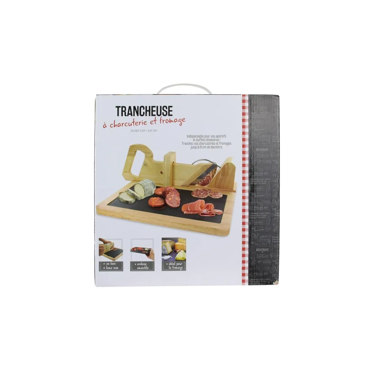 Trancheuse manuelle pour charcuterie et fromages - Lame inox - Plateau ardoise amovible - Goupille de sécurité - Coupe jusqu’à 6 cm