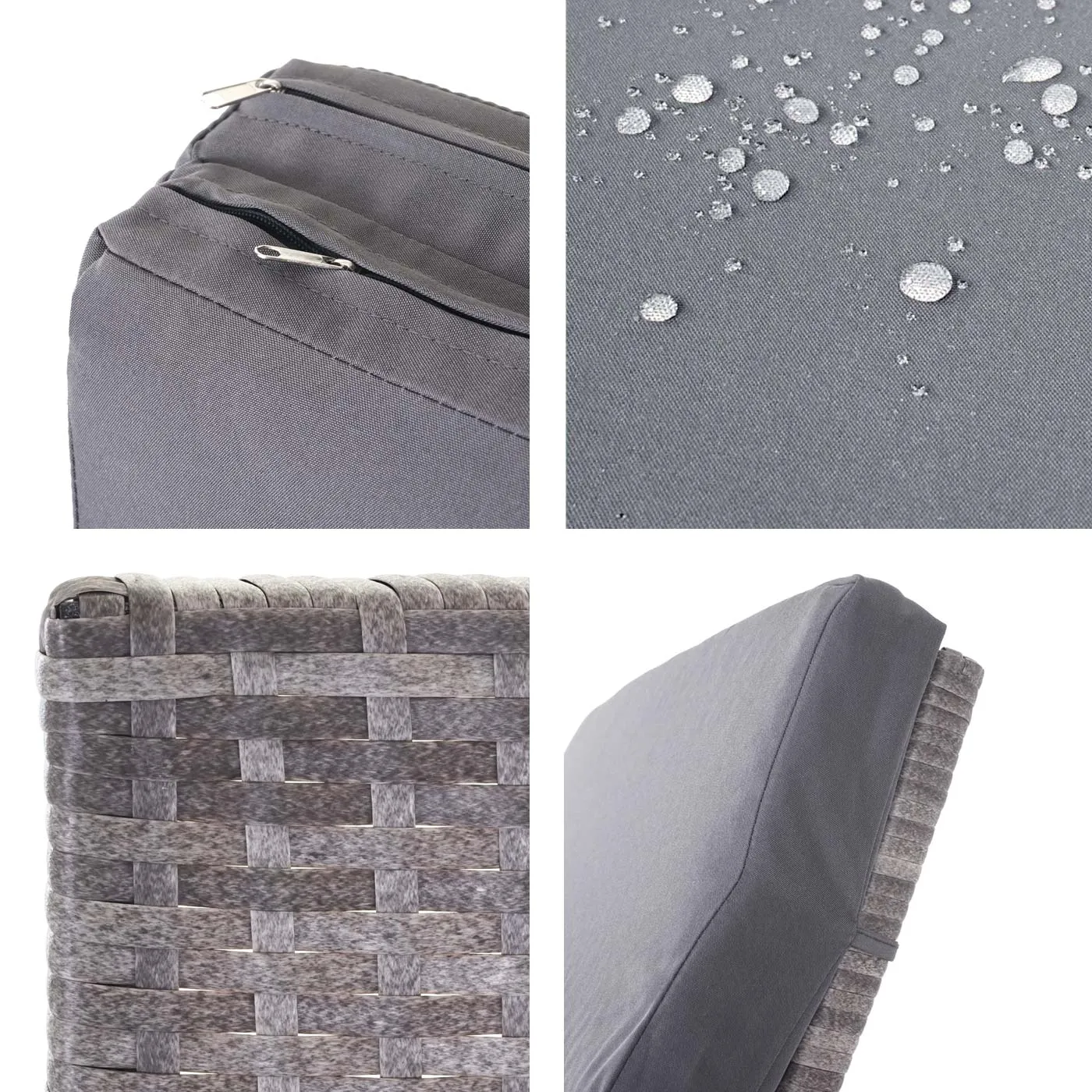Le coussin en polyester, d'une épaisseur de 5 cm pour un accueil uniforme sur toute la longueur, se retire facilement grâce à la fermeture éclair. Les sangles de fixation aident à maintenir l'alignement du coussin pendant les déplacements. Les roues de Ø 21 cm offrent une manuvre fluide pour repositionner la chaise sans effort. Pliable, la structure facilite le rangement saisonnier, et la finition gris sobre s'intègre à des aménagements extérieurs variés sans surcharger l'espace.