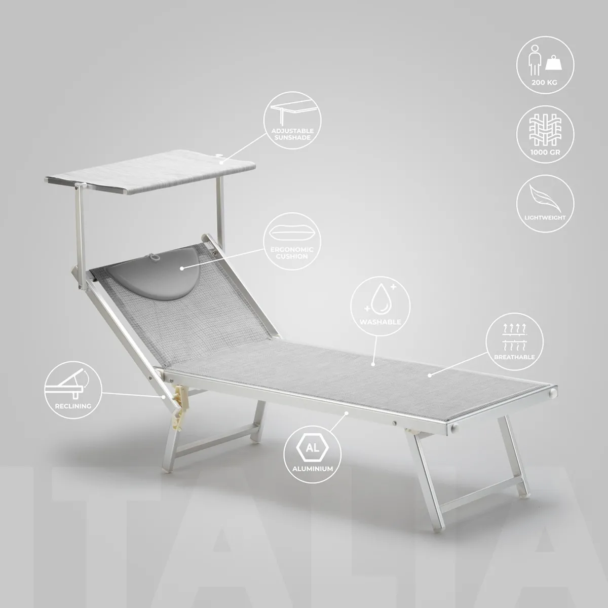La structure 100 % aluminium anodisé, associée à des profils de 1,5 mm d'épaisseur, offre une base solide pour un usage intensif. Le dossier réglable en 3 positions confortables permet d'alterner lecture, repos et bronzage. Le tissu en textilène lavable de grammage extra apporte maintien et ventilation, utile par temps chaud. Le pare-soleil réglable limite l'éblouissement, tandis que le coussin thermo-soudé de 2 cm soutient la tête sans surépaisseur gênante.