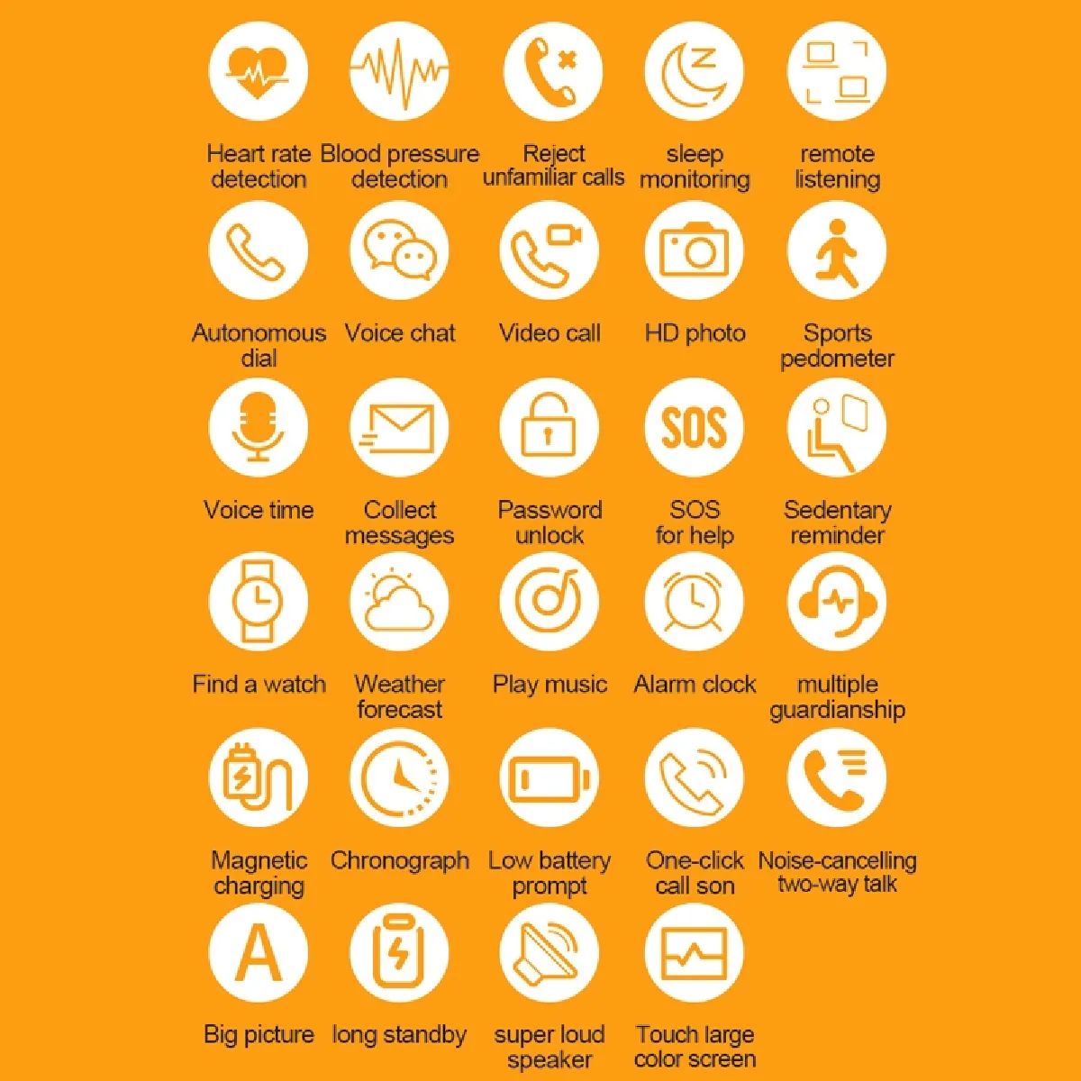 - Fonctions : Détection de la fréquence cardiaque, rappel médical, suivi de la condition physique, moniteur de sommeil, SOS one key call for help, clôture électronique, historique, etc.