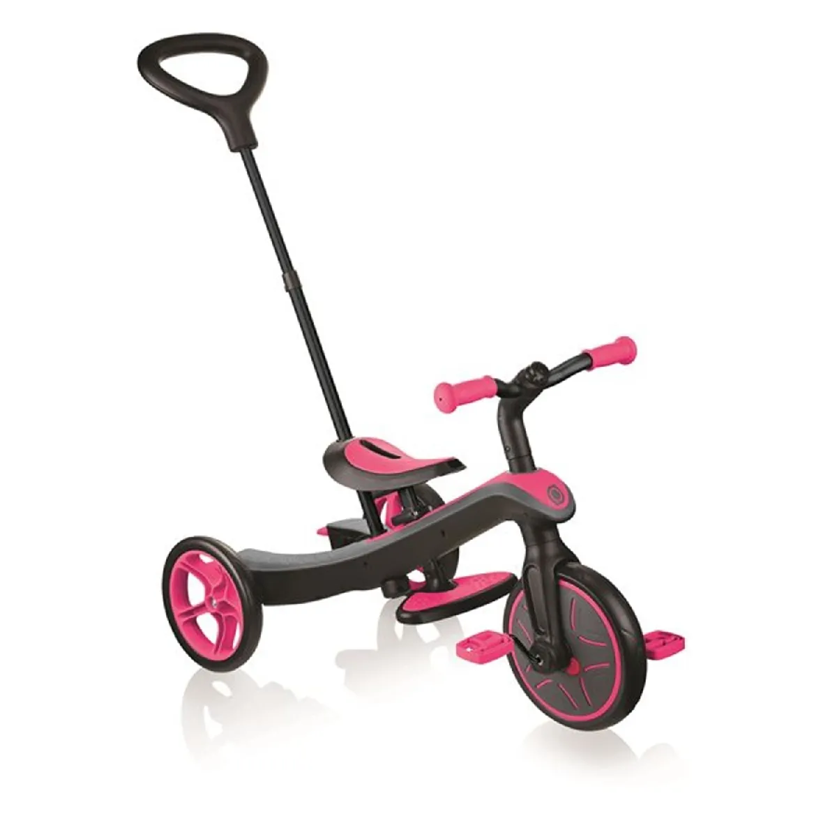Authentic Sports 632-110 Globber EXPLORER TRIKE 4 en 1 - Tricycle évolutif et draisienne rose - - Pourquoi acheter différents produits quand tout est compris avec le tricycle EXPLORER 4 en 1 de Globber* Ce tricycle évolutif s'adapte à votre enfant au fur et à mesure de sa croissance grâce à ses différents modes. Le design unique du modèle EXPLORER simplifie la vie de tous les jours : montez-le et changez de mode sans outils. En mode tricycle confort à partir de 10 mois, ce tricycle évolutif a tous les équipements pour garantir sécurité et confort : siège haut ajustable sur 2 hauteurs (32/35 cm), repose-tête, freins à l'arrière (sur chaque roue), harnais de sécurité 5 points, barre de sécurité et pare-soleil amovible anti-UV. La canne directionnelle est ajustable sur 2 hauteurs (92/96 cm). En mode tricycle, guidé ou autonome, la selle antidérapante s'ajuste sur 2 niveaux de hauteur (31/34 cm), le repose-pieds est amovible avec rangement intégré. La roue avant de 250 mm de diamètre est dotée d'un système de verrouillage/déverrouillage. Roues arrière de 220 mm de diamètre en mousse EVA increvables et silencieuses. L'EXPLORER 4 en 1 a un mécanisme de transformation des roues unique qui permet de passer facilement de tricycle à draisienne, sans outil. - - - À partir de 15 mois