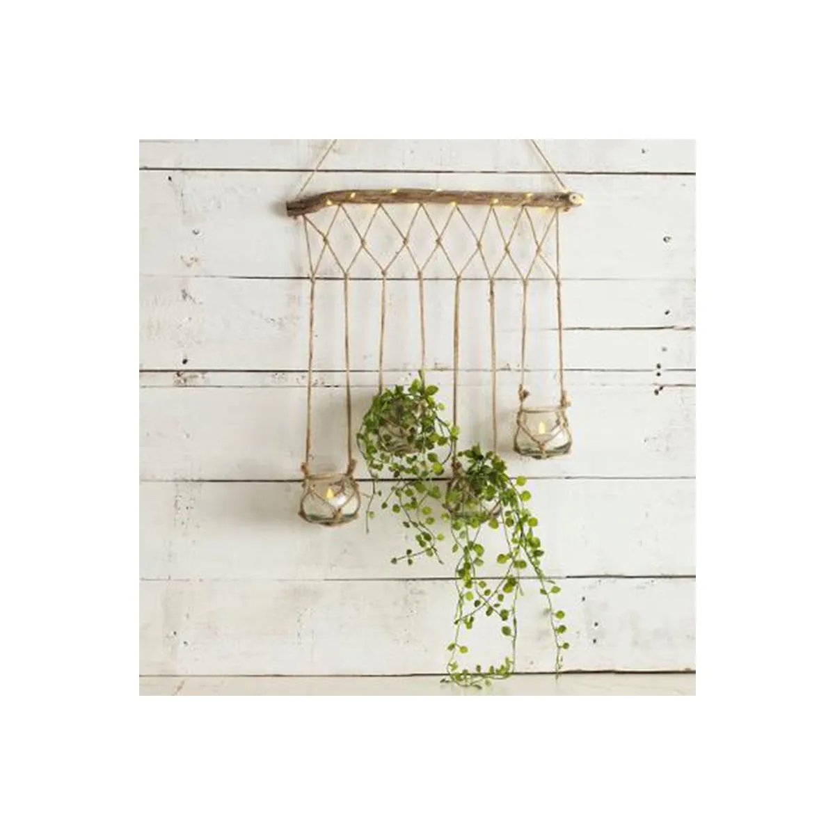 Commentaire vendeur : Informations Techniques : Dimensions : L. 44 x H. 70 cm Matière : Sapin & Verre Spécificités : Tendance & Moderne Suspension design A Led Contient 4 Soliflores Fonctionne à Piles (2 x CR2032 non incluses) Poids : 1 kg Couleur : Naturel