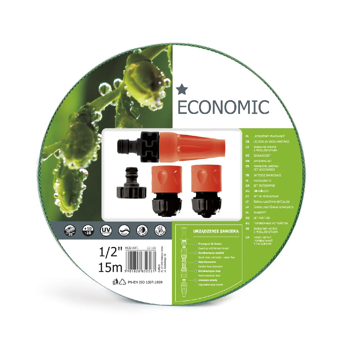 Kit d'arrosage de jardin Tuyau 15m 1/2 " et arroseur Cellfast Ensemble de jardin économique Cellfast, qui comprend un tuyau de 15 m 1/2 ", un arroseur droit, une attache rapide d'arrêt, une attache rapide de passage, une connexion avec filetage intérieur 1/2". Tuyau à 3 couches, résistant aux rayons UV et au dépôt d'algues à l'intérieur du tuyau. Types de jets d'arrosage: brouillard; point fort. Kit contient: - Tuyau Cellfast ECONOMIQUE 15m 1/2 " - Arroseur simple - Attache rapide - arrêt - Attache rapide - passage - Connexion avec filetage intérieur 1/2 " Spécifications techniques: - Nom: Cellfast 10-101 - Catégorie: irrigation de jardin - Longueur du tuyau: 15m - Taille: 1/2 " - Pression bar: 20 bar - Plage de température de fonctionnement: -10 / + 50 ° - Résistant aux rayons UV et au dépôt d'algues à l'intérieur du tuyau - Nombre de couches: 3 - Types de flux d’asperseurs: brouillard; point fort