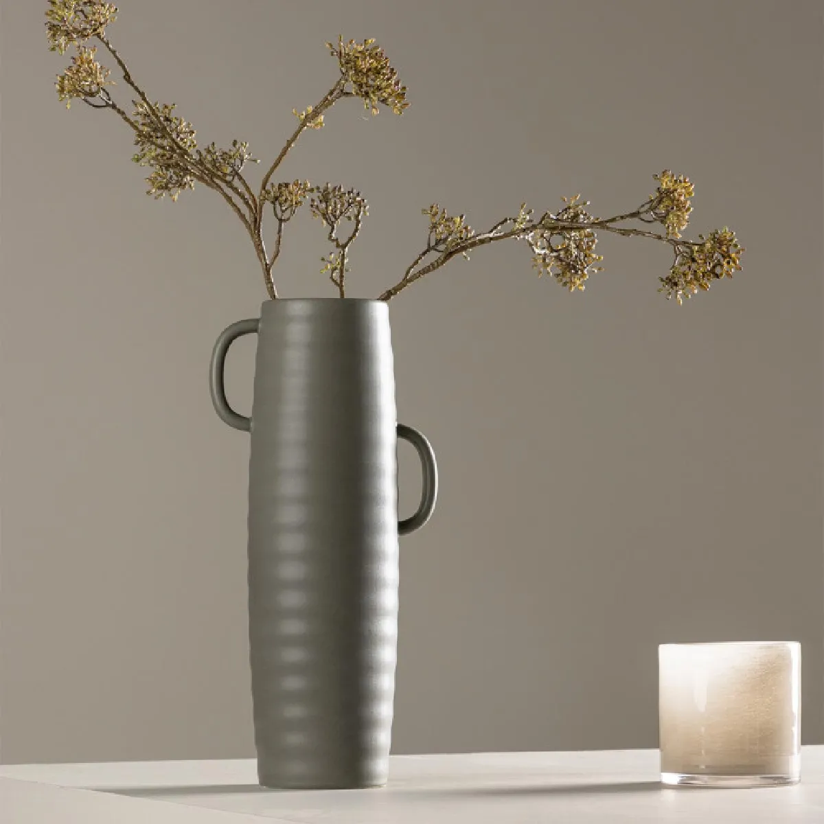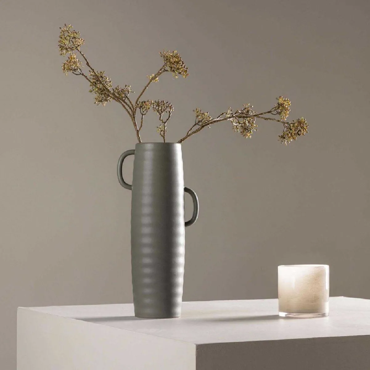 Commentaire vendeur : Informations Techniques : Dimensions : L. 19 x l. 13 x H. 41 cm Diamètre : D. 13 cm Matière : Grès Spécificités : Moderne & Élégant Vase design ondulé Avec petites anses Poids : 1,95 kg Couleur : Gris Foncé