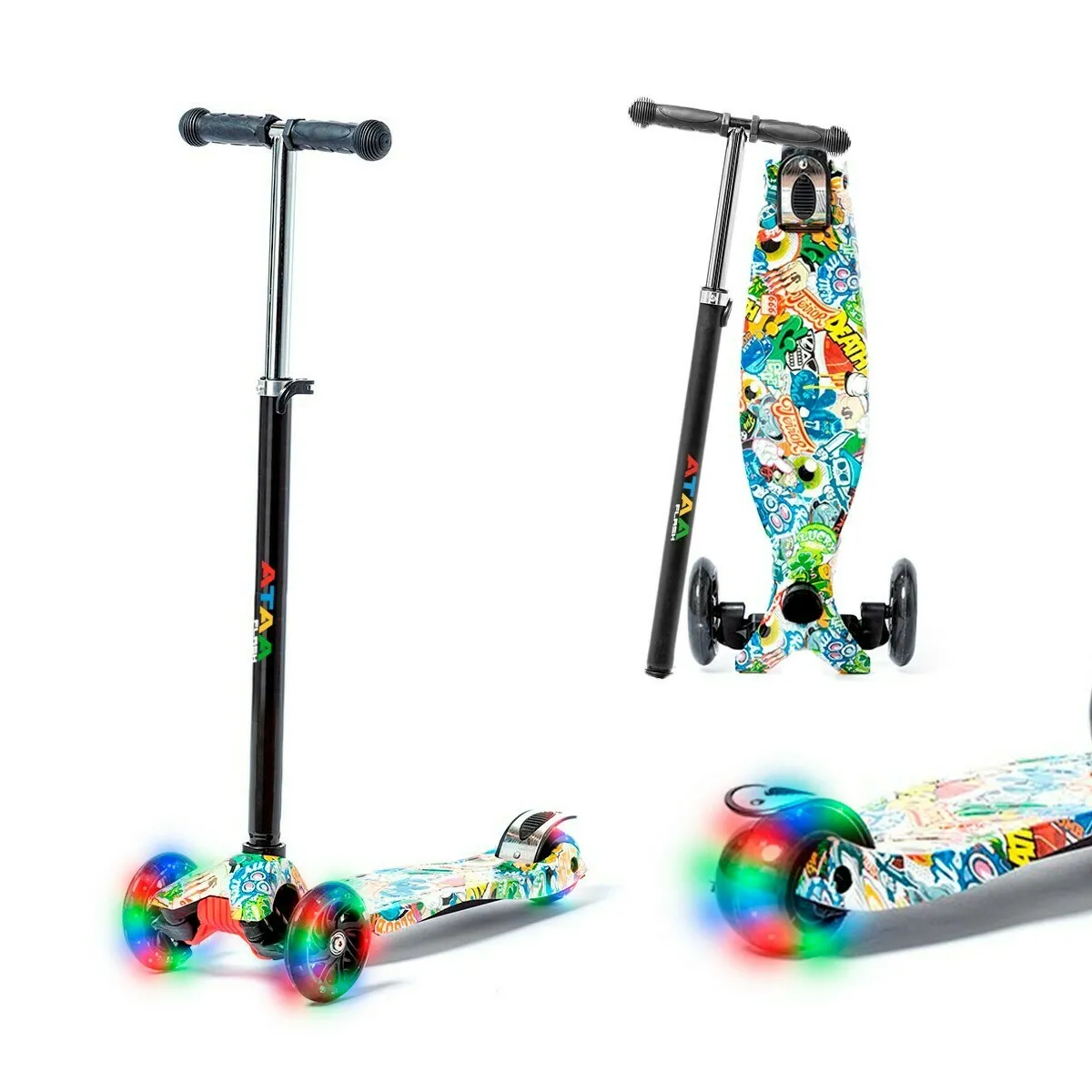 Trottinette évolutive à 3 roues avec LED ATAA FlashL'une des meilleures options pour que les enfants s'amusent à l'extérieur, veuillent nous accompagner pour se promener dans le parc, est de le faire avec un moyen de transport amusant comme une trottinette. La trottinette 3 roues ATAA Flash réglable en hauteur, c'est une trottinette idéale pour les jeunes enfants et les plus grands pour profiter d'un moment de jeu et d'exercice en même temps. Il ne sera sûrement pas difficile de les convaincre de faire un tour sur cette fantastique trottinette car elle ne manque pas de détails avec ses couleurs vives uniques et ses lumières LED sur les 3 roues.De plus, la trottinette 3 roues ATAA Flash est réglable en hauteur, ce qui vous permettra d'en profiter de 3 ans à 9 ans environ, ses roues en PU sont très résistantes, et sa configuration 3 roues offre une stabilité idéale pour les plus petits, son système unique de direction par gravité garantit une bonne stabilité, les risques de chute sont minimes ! Offrez du bonheur à vos enfants avec une fantastique trottinette ATAA Flash.Caractéristiques de la trottinette ATAA Flash 3 roues :- Marque: ATAA- Modèle : Flash- Poids de la trottinette : 3 kg- Roues PU anti-crevaison, diamètre des roues avant 12cm et de la roue arrière 8cm.- Pédale de frein arrière très large avec surface antidérapante.- Partie centrale du scooter avec reliefs anti-dérapants.- Guidon réglable en hauteur 3 positions.- Lumières Led sur les 3 roues (elles fonctionnent avec le mouvement des roues).- Deux roues avant pour plus de stabilité.- Système de direction par gravité pour exercer l'équilibre des enfants, pour tourner les enfants doivent se pencher au lieu de tourner le guidon.- Âge recommandé : jusqu'à environ 9 ans.- Dimensions de la trottinette min : 73cm hauteur X 22cm largeur X 55cm longueur.- Dimensions maximale de la trottinette : 84 cm de hauteur x 22 cm de largeur x 55 cm de longueur.- Poids maximum autorisé de l'enfant : 40 kg.- Certificats de sécurité CE pour les jouets.*N'oubliez pas d'utiliser les systèmes de protection nécessaires tels qu'un casque et des protège-coudes et genoux pour une plus grande sécurité des enfants.