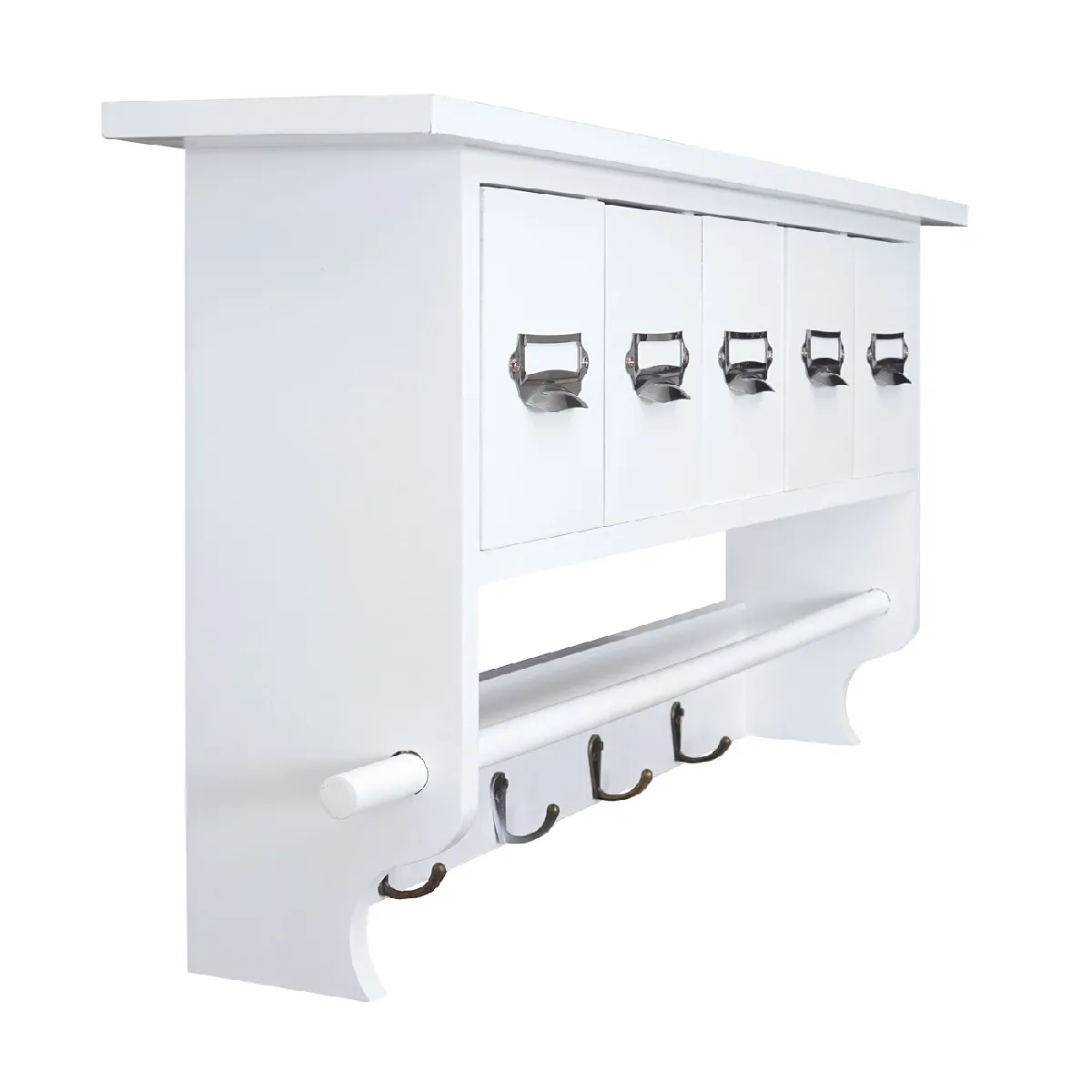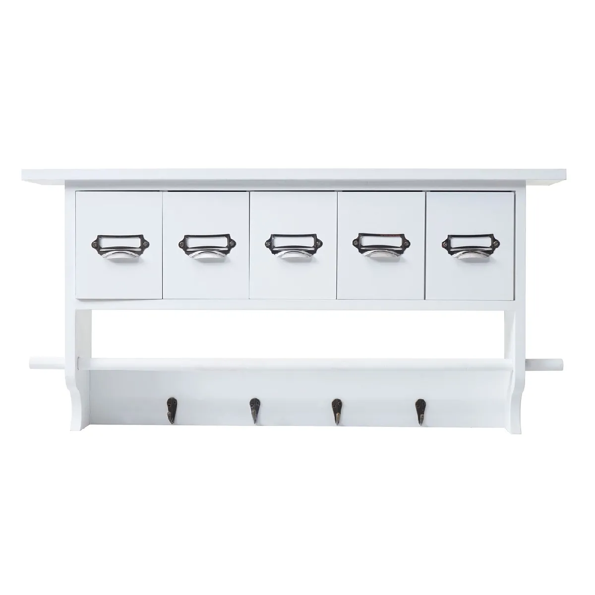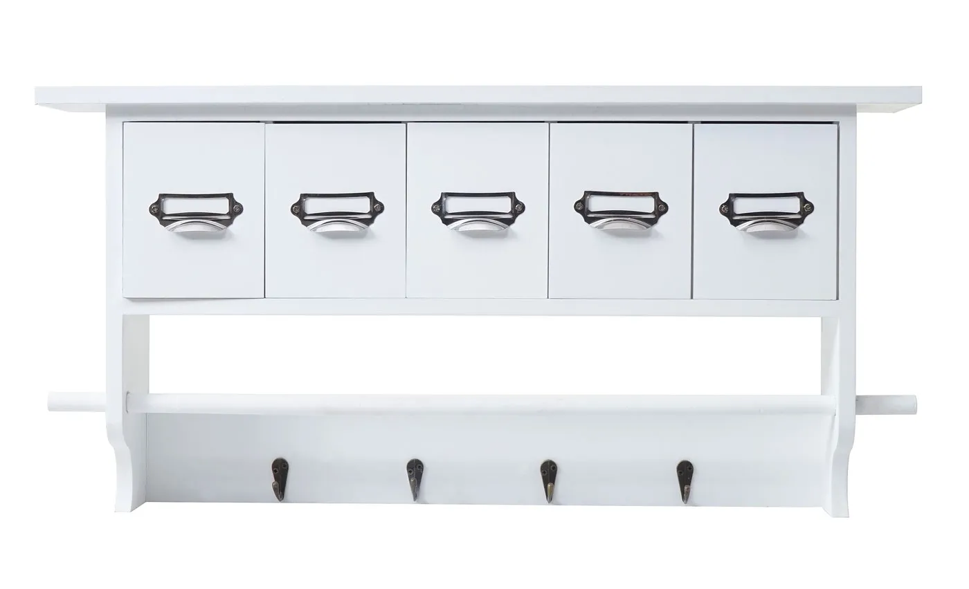 La structure associe bois massif de paulownia et patères en métal aspect laiton pour une tenue pratique au quotidien. Le style shabby chic met en valeur une surface brossée au rendu vintage et discret, adaptée à l'entrée, au couloir ou à la chambre. La plage arrière de 65 x 13 cm assure un appui visuel homogène et un alignement propre des éléments. Les étiquettes ne sont pas incluses, ce qui laisse la liberté de personnaliser le classement selon les usages.