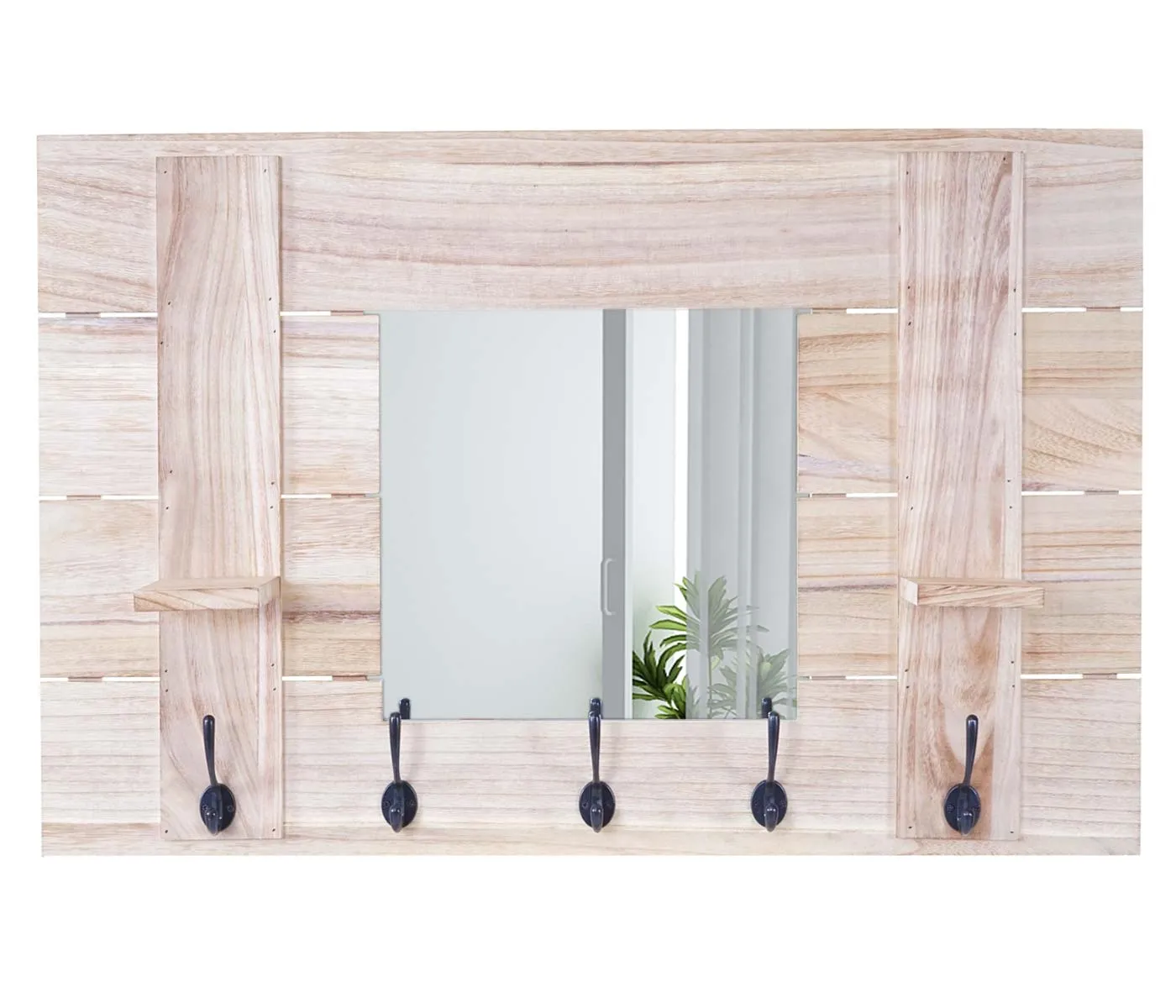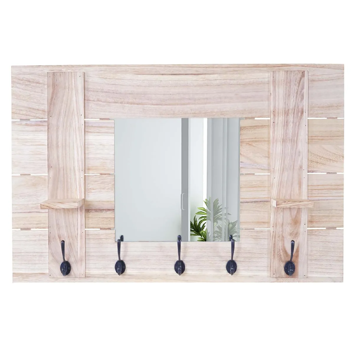Le miroir intégré facilite les derniers ajustements avant de sortir, tandis que les 5 crochets espacés pour manteaux et accessoires gardent l'entrée ordonnée. Le bois de paulownia apporte une structure légère et stable, avec une finition brossée d'inspiration shabby chic qui s'intègre à différents intérieurs. Les deux petites surfaces de dépose accueillent clés, lunettes ou petits objets du quotidien pour limiter l'encombrement. Le format mural 90 x 60 x 14,5 cm adapté aux couloirs optimise l'espace disponible sans gêner la circulation.