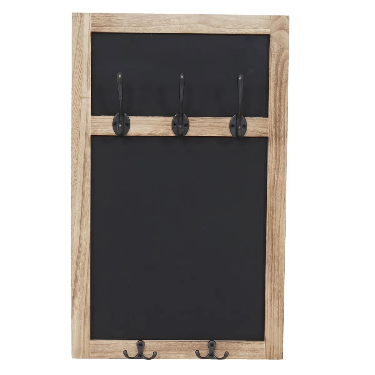 Idéal pour l'entrée, ce portemanteau combine cinq crochets fonctionnels et deux tableaux noirs pour noter listes et rappels au quotidien. La structure en bois de paulownia léger et stable facilite l'installation tout en offrant une bonne tenue à l'usage. Le format compact de 55 x 34 x 7 cm convient aux espaces réduits et apporte une touche sobre grâce à la finition noire et au style shabby. Les illets d'accrochage inclus permettent une fixation simple sur un mur adapté.