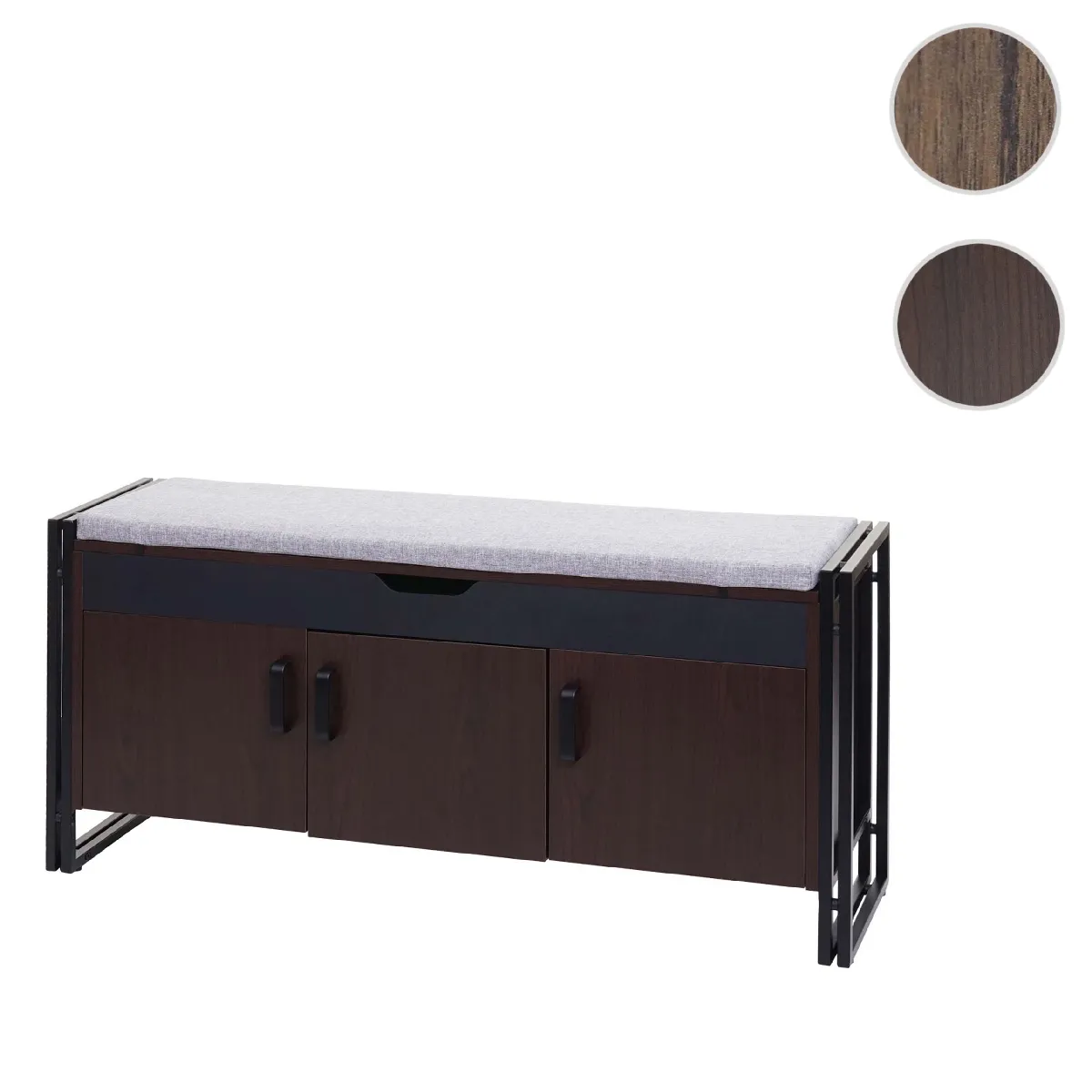 La conception combine MDF et métal pour une utilisation robuste, avec des volumes utiles clairement répartis : 102 cm de largeur d'assise et 3 cm de rembourrage pour le confort, compartiment sous l'assise de 6,5 x 100 x 25,5 cm pour les accessoires. Les rangements à porte proposent deux modules à droite de 29 x 34 x 26 cm et un à gauche de 29 x 65 x 26 cm, pratiques pour séparer les paires et objets du quotidien. Livré sans décoration.