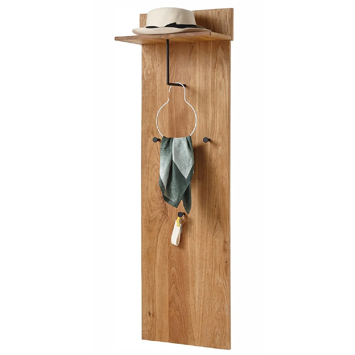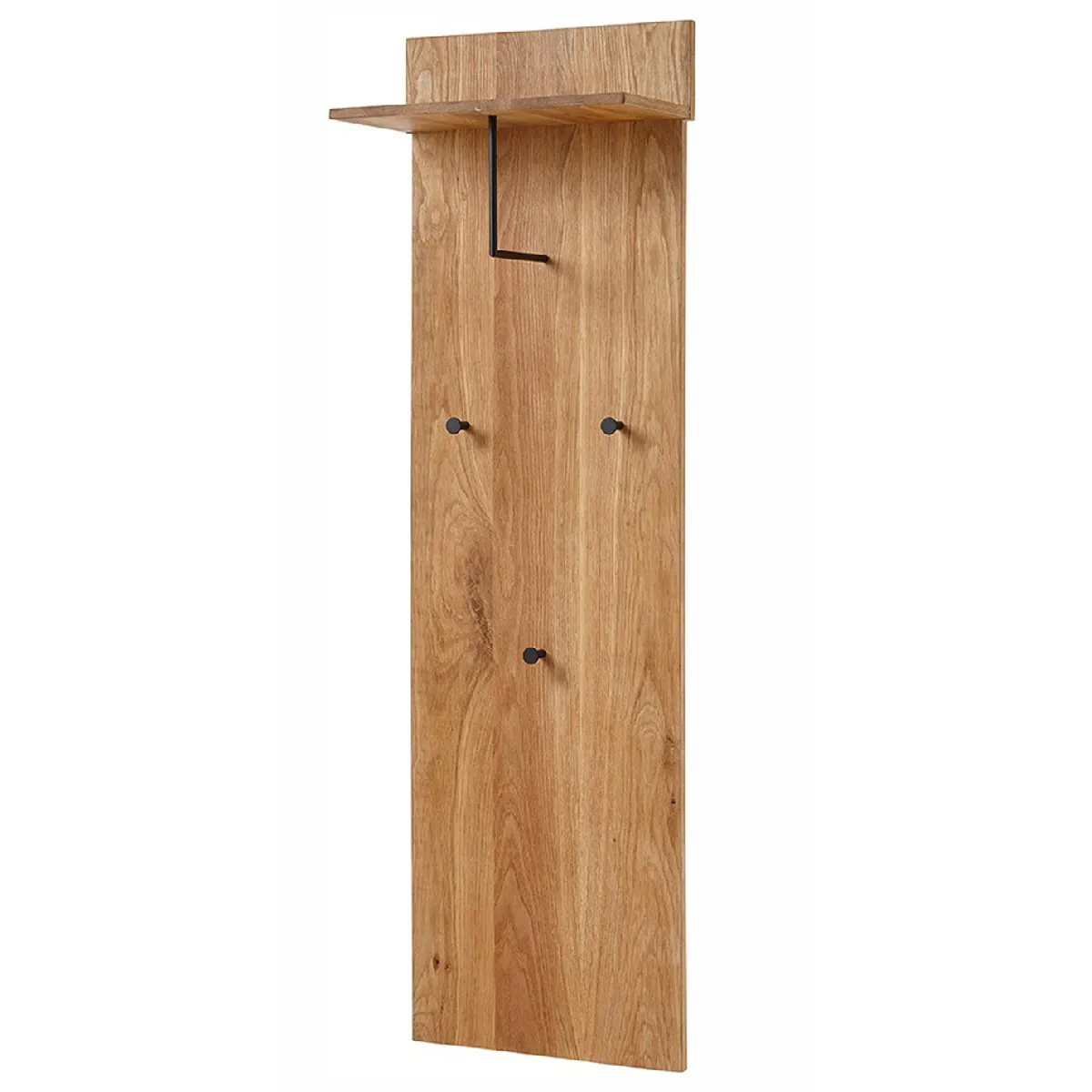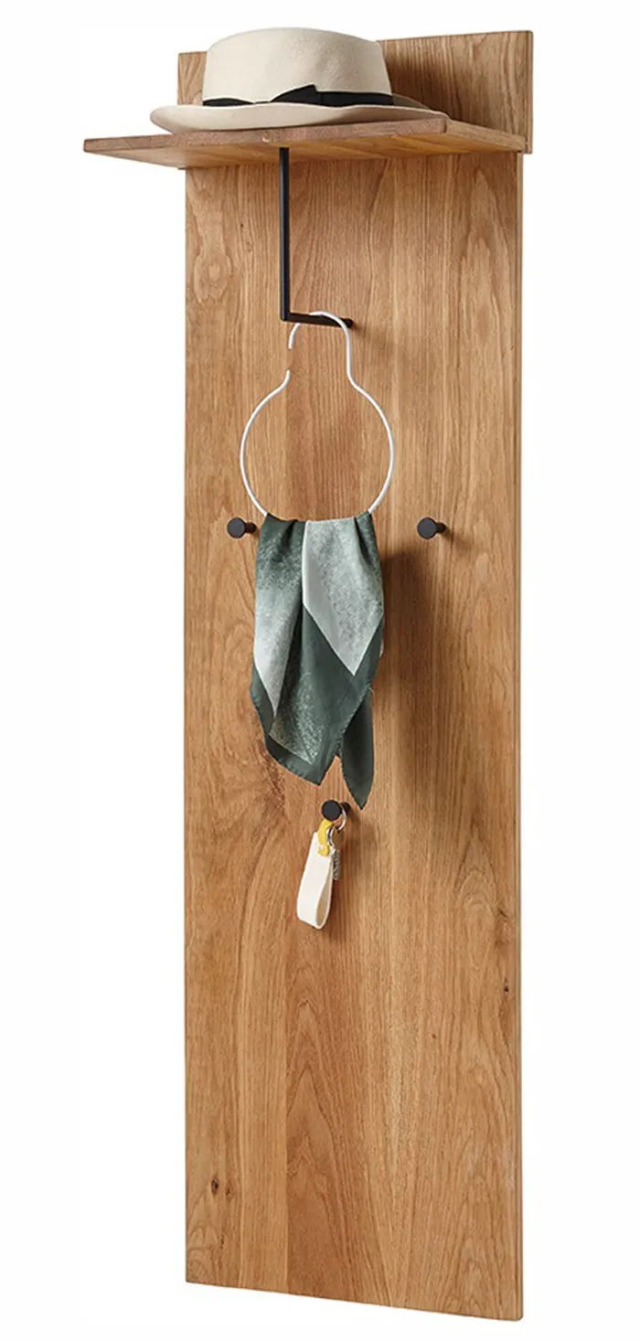 Optimisez l'entrée avec un panneau vestiaire en chêne massif huilé au style moderne, pensé pour accueillir les essentiels du quotidien sans encombrer l'espace. La structure murale intègre une étagère supérieure pour chapeaux et accessoires, ainsi qu'une tringle dédiée aux vêtements pour garder manteaux et écharpes accessibles. Trois crochets robustes complètent l'ensemble pour les pièces à saisir rapidement. Les dimensions L.42 x H.135 x P.20 offrent un faible encombrement adapté aux couloirs étroits, tout en assurant une capacité d'accueil efficace.