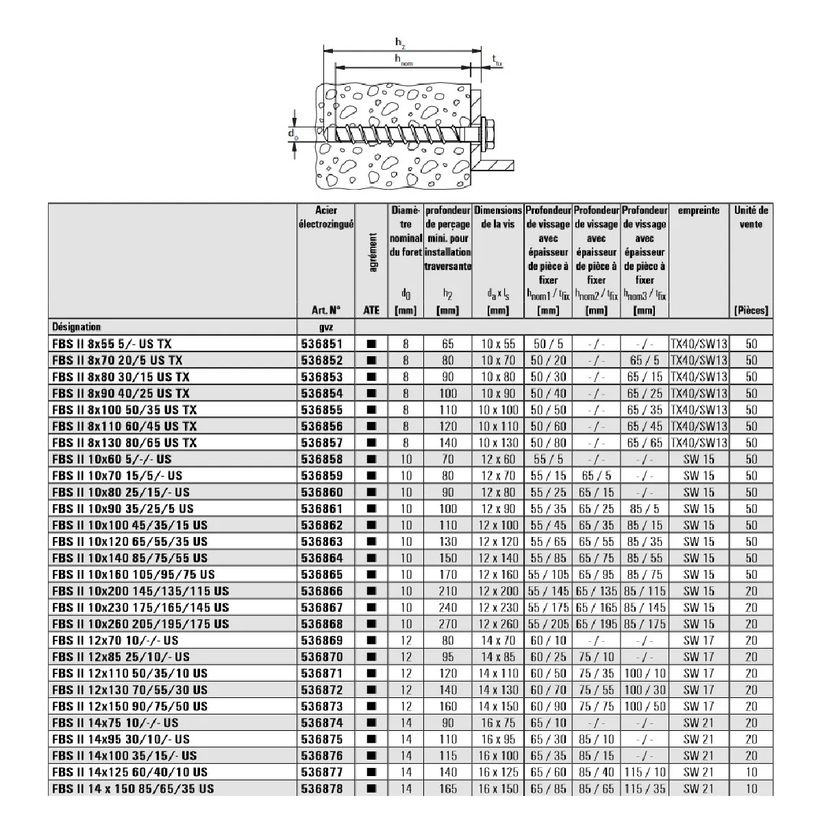 La vis à béton Ultracut FBS II de la marque Fischer à tête fraisée et à empreinte Torx est une vis à béton à hautes performances agréée ATE pour les applications dans le béton fissuré. Elle peut se fixer très rapidement et sans effort grâce à sa géométrie spéciale en dents de scie, favorisant la pénétration rapide dans le béton. De plus, elle offre une flexibilité optimale concernant les charges et les épaisseurs à fixer. L'ancrage sans dilatation (contre-dépouille) garantit un jeu axial et des bords très bas. Caractéristiques techniques :Applications :Barres d'appuiConsoles / platinesProfilés métalliques Matériaux :Agréée pour :Béton C 20 / 25 à C 50 / 60, fissuré et non fissuréBéton C 12 / 15Matériaux de construction pleinsMaçonnerie à structure dense