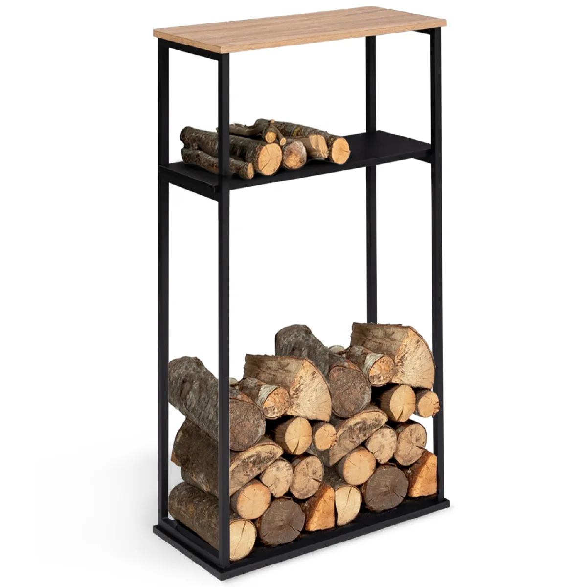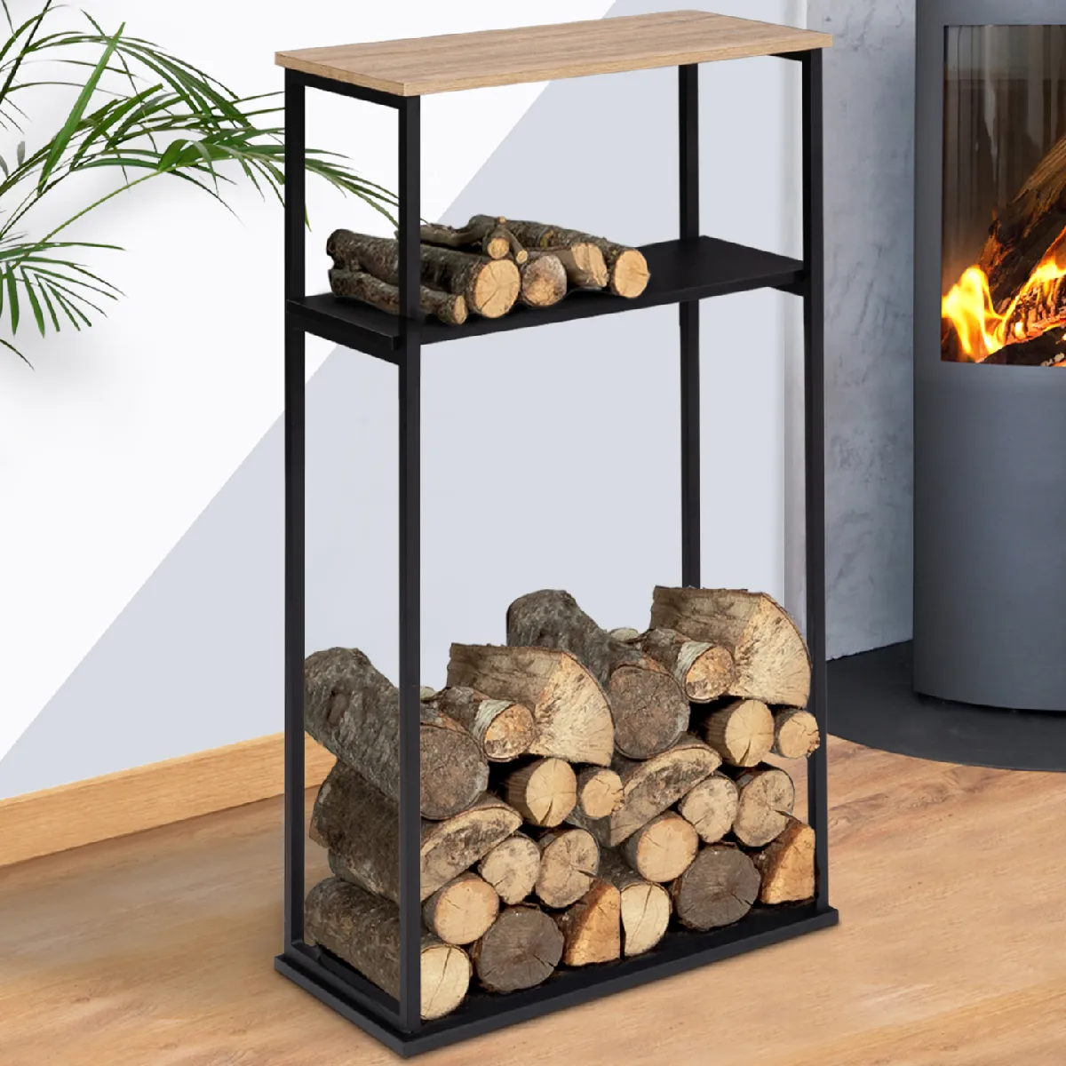 Range bûches vertical - Acier noir et plateaux effet bois - 66 x 33 x 112 cm