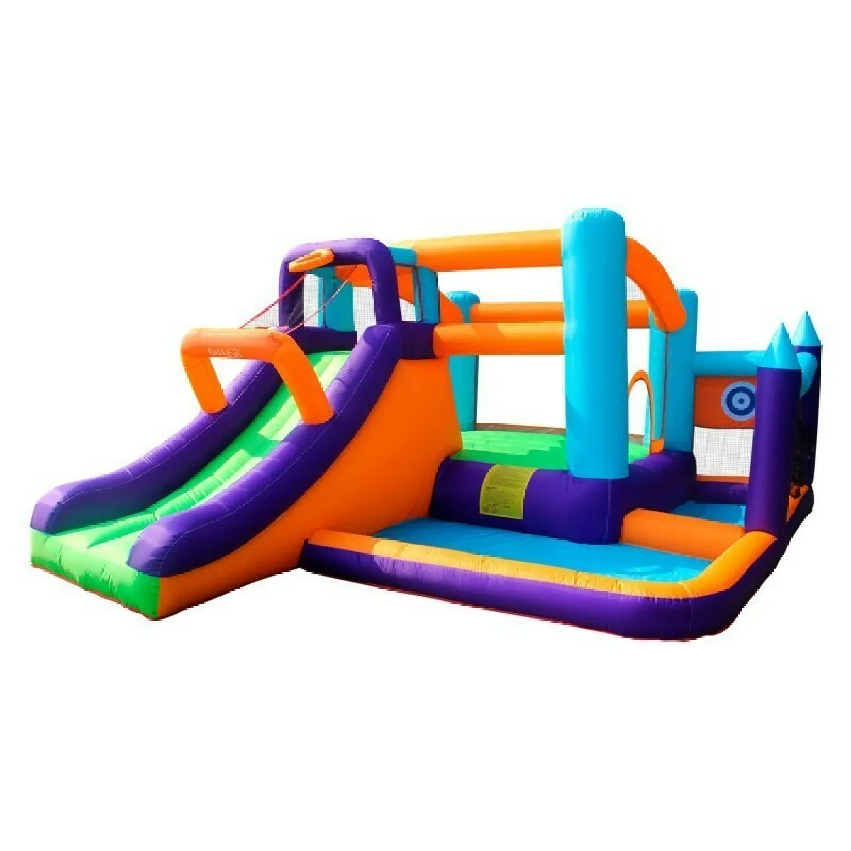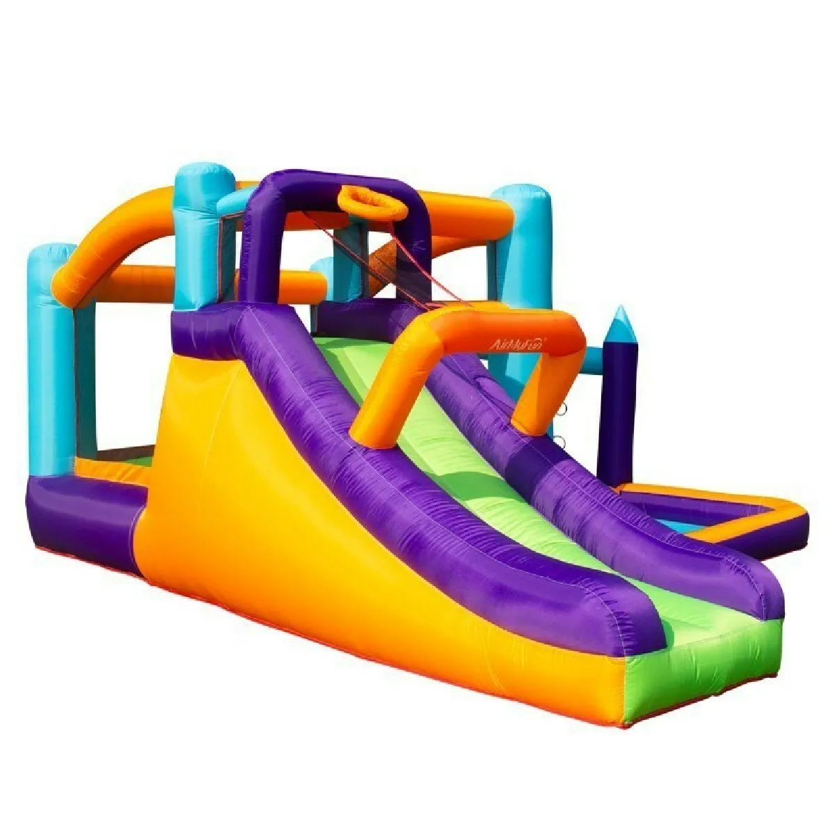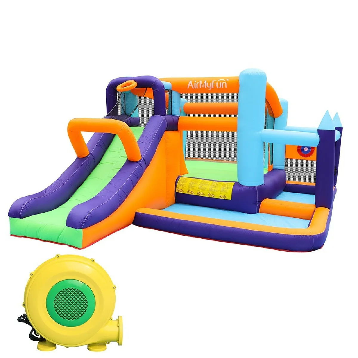 Château gonflable avec toboggan - Filet de protection - Zone de saut - Panier de basket