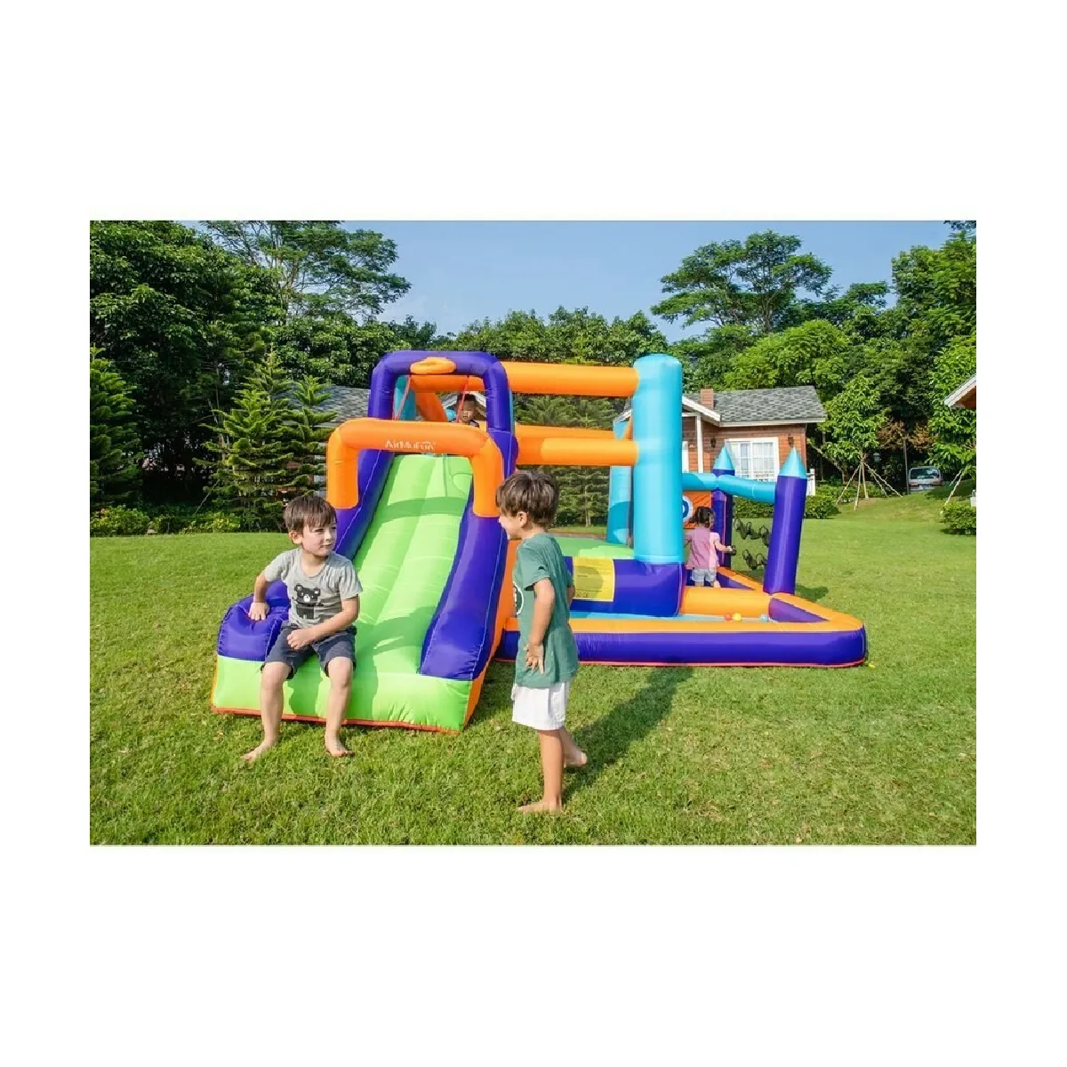 Château gonflable Clark avec toboggan et zone de saut protégéeLe château pour enfants Clark est solide et ferme, vous pouvez donc être sûr qu'il durera longtemps et résistera à une utilisation quotidienne. Ce château gonflable dispose d'un panier de basket, d'une cible pour les balles et d'une zone de saut avec un filet de protection, pour que les enfants puissent jouer et s'amuser de différentes manières. Il comprend également une piscine à balles et un filet avec des trous pour les balles, ce qui en fait l'endroit idéal pour jouer et développer les compétences de coordination.Si vous cherchez un château gonflable pour enfants avec multitudes d’activités pour les enfants, ce modèle avec un toboggan et plusieurs aires de jeux est le choix parfait. Avec ses caractéristiques uniques et sa facilité d'utilisation, c'est le produit idéal pour tout événement pour enfants. Amusez les enfants et créez des souvenirs inoubliables avec le château gonflable Clark !Caractéristiques du château gonflable pour enfants Clark :- Marque : WATAA- Modèle : Clark- Conception de château avec un petit fossé.- Toboggan : oui, 1 grand.- Ballon gonflable inclus.- Panier de basket.- Piscine à balles (balles non incluses).- Zone de saut protégée par des filets.- Cible pour lancer des boules à scratch (2 petites boules incluses).- Filet ou lancer les balles.- Pompe à air avec moteur 450w (inclus).- Système d'ancrage : avec 7 piquets.- Sac de transport : oui.- Kit de réparation : oui.- Nombre maximum d'utilisateurs en même temps : 3 enfants.- Âge recommandé : à partir de 3 ans.- Poids maximum recommandé : jusqu'à 135 kg.- Dimension château gonflable : 430 x 330 x 190 cm.- Poids du château gonflable pour enfants : 25 kg.* NE CONVIENT PAS À UNE UTILISATION AVEC DE L'EAU.** RECOMMANDATIONS :- Toujours utiliser sous la surveillance d'un adulte.- Ancrez solidement le produit au sol.- Utiliser dans un espace ouvert suffisamment éloigné des fenêtres, des escaliers, des portes vitrées, des angles vifs ou des objets ou meubles qui pourraient blesser l'utilisateur en jouant.-La présence de petites perforations autour des coutures du château est tout à fait normale, car ces perforations sont nécessaires pour éviter l'éclatement lorsqu'elles reçoivent un flux d'air constant.