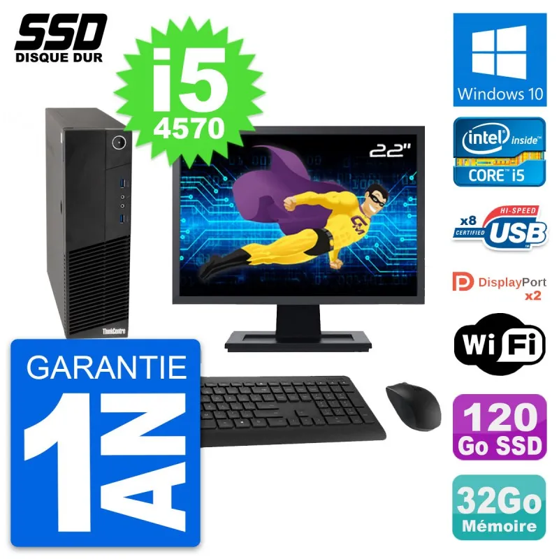 La compacité du châssis SFF libère de l'espace tout en offrant une configuration stable pour les tâches de bureautique, de navigation et d'affichage multi-écrans. Avec son processeur Intel Core i5-4570 à 4 coeurs et son SSD de 120 Go pour des démarrages rapides, ce poste assure une réactivité appréciable au quotidien. Les 32 Go de mémoire DDR3 facilitent l'exécution de multiples applications et la gestion de documents volumineux. La connectique comprend deux DisplayPort et une sortie VGA pour piloter plusieurs écrans, ainsi qu'un réseau filaire Gigabit et une connexion WiFi via clé USB. L'ensemble est complété par un écran 22 pouces, un clavier et une souris pour une prise en main immédiate.